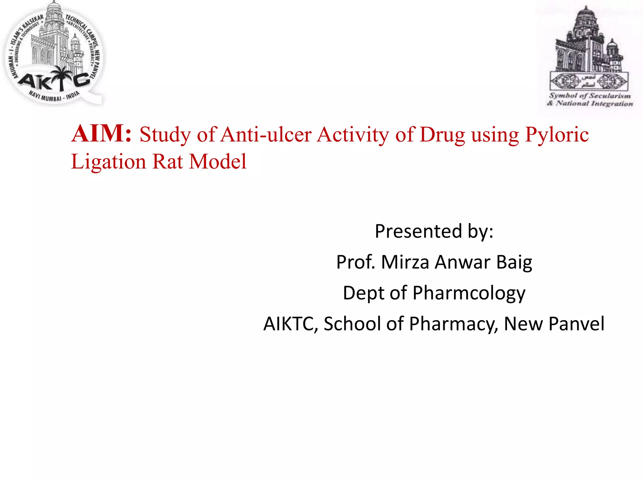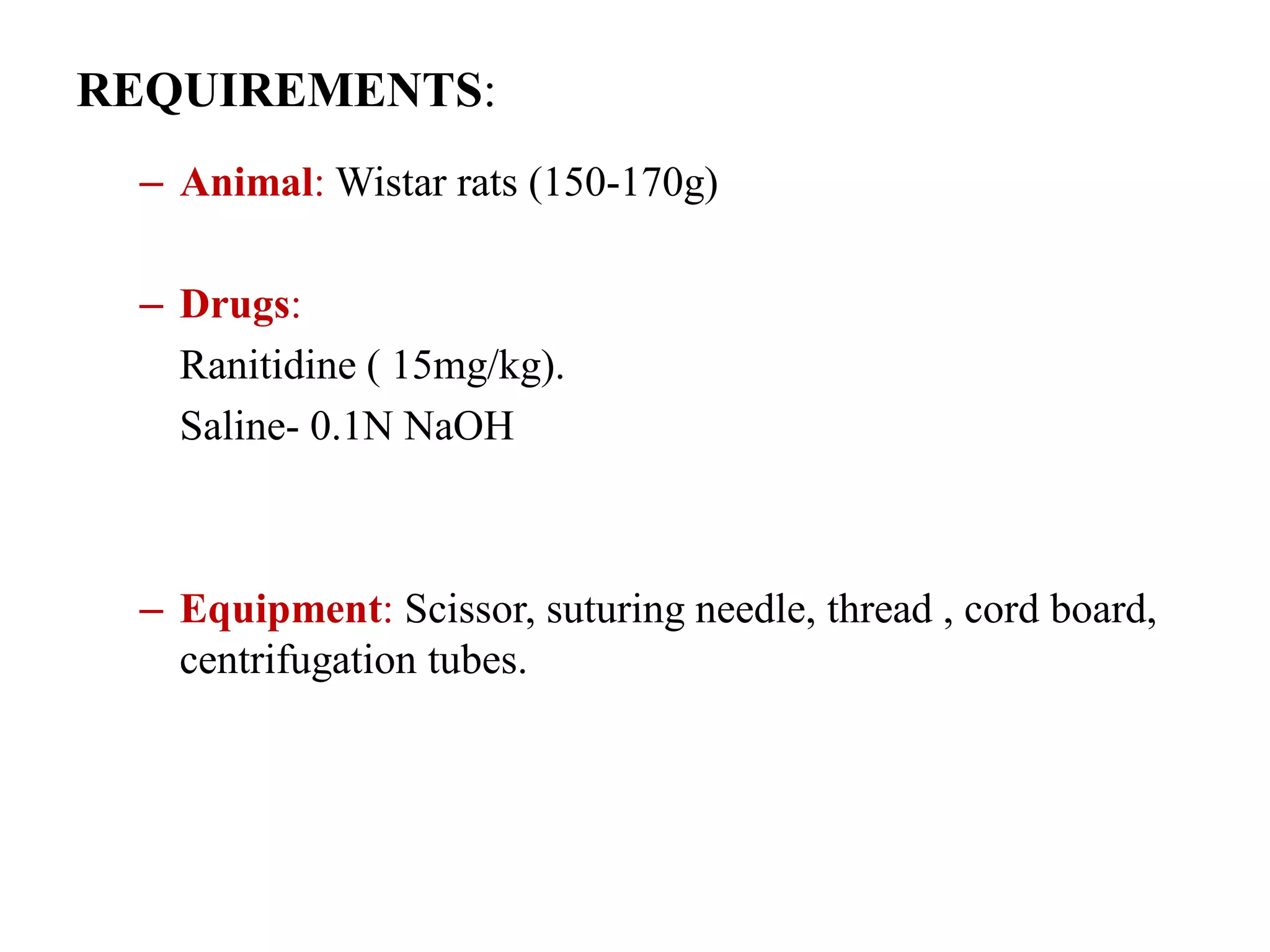 This document describes a study to evaluate the anti-ulcer activity of a drug using a pyloric ligation rat model. It outlines the requirements including animal type, drugs to be tested, and equipment needed. It then describes the principle behind gastric acid secretion and ulcer formation. The procedure involves starving rats for 24 hours, ligating the pylorus, administering test compounds, sacrificing the rats, and examining the stomachs to measure ulcer indices, gastric acidity, and percent ulcer protection. Treatment with the standard drug ranitidine is expected to reduce ulceration, acidity, and increase ulcer protection compared to saline control.