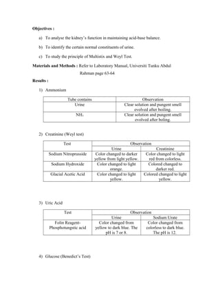 The methods are referred to in a laboratory manual. Results show urine samples changing color when reacted with various reagents, indicating the presence of ammonium, creatinine, uric acid, and glucose.