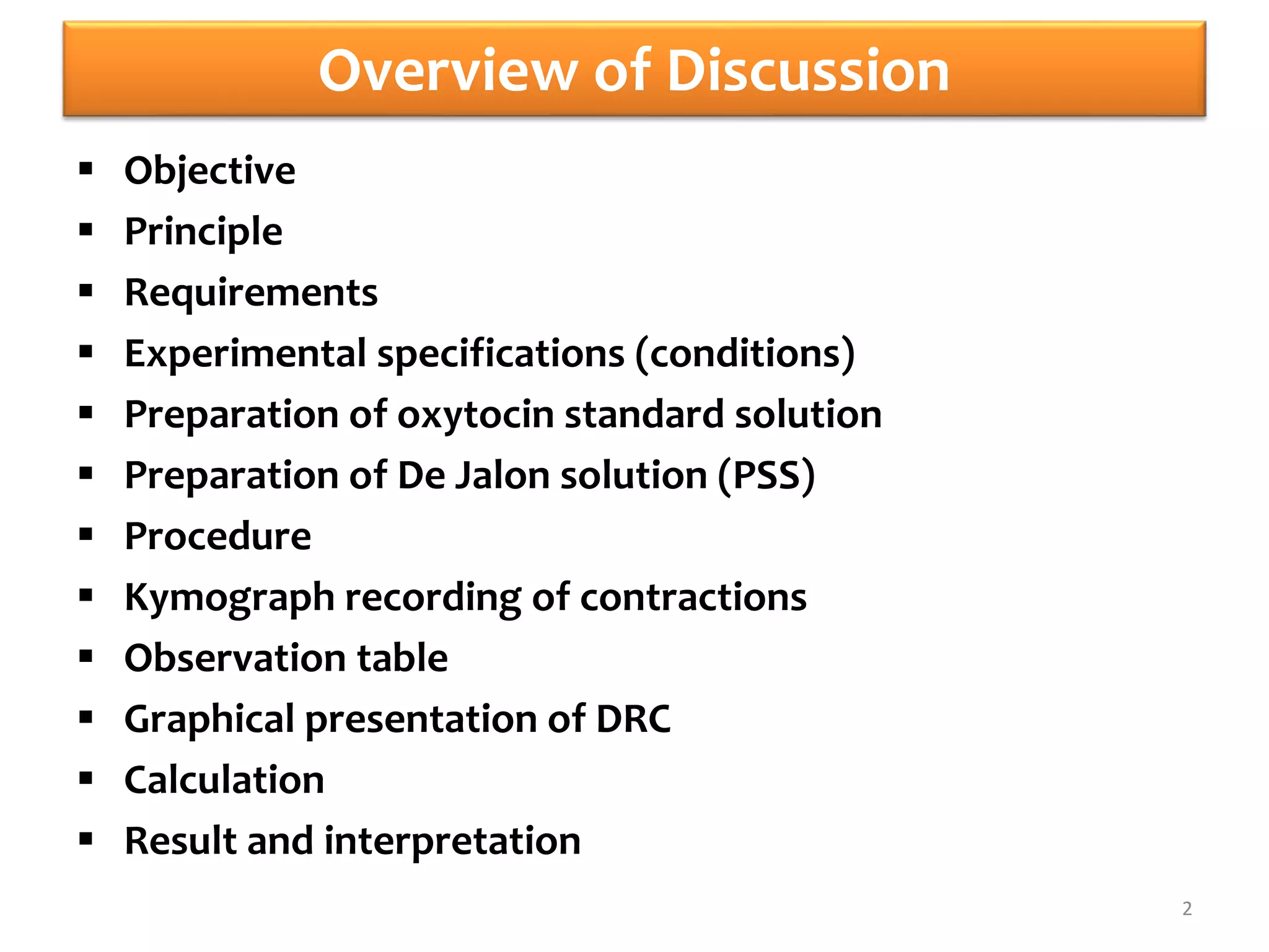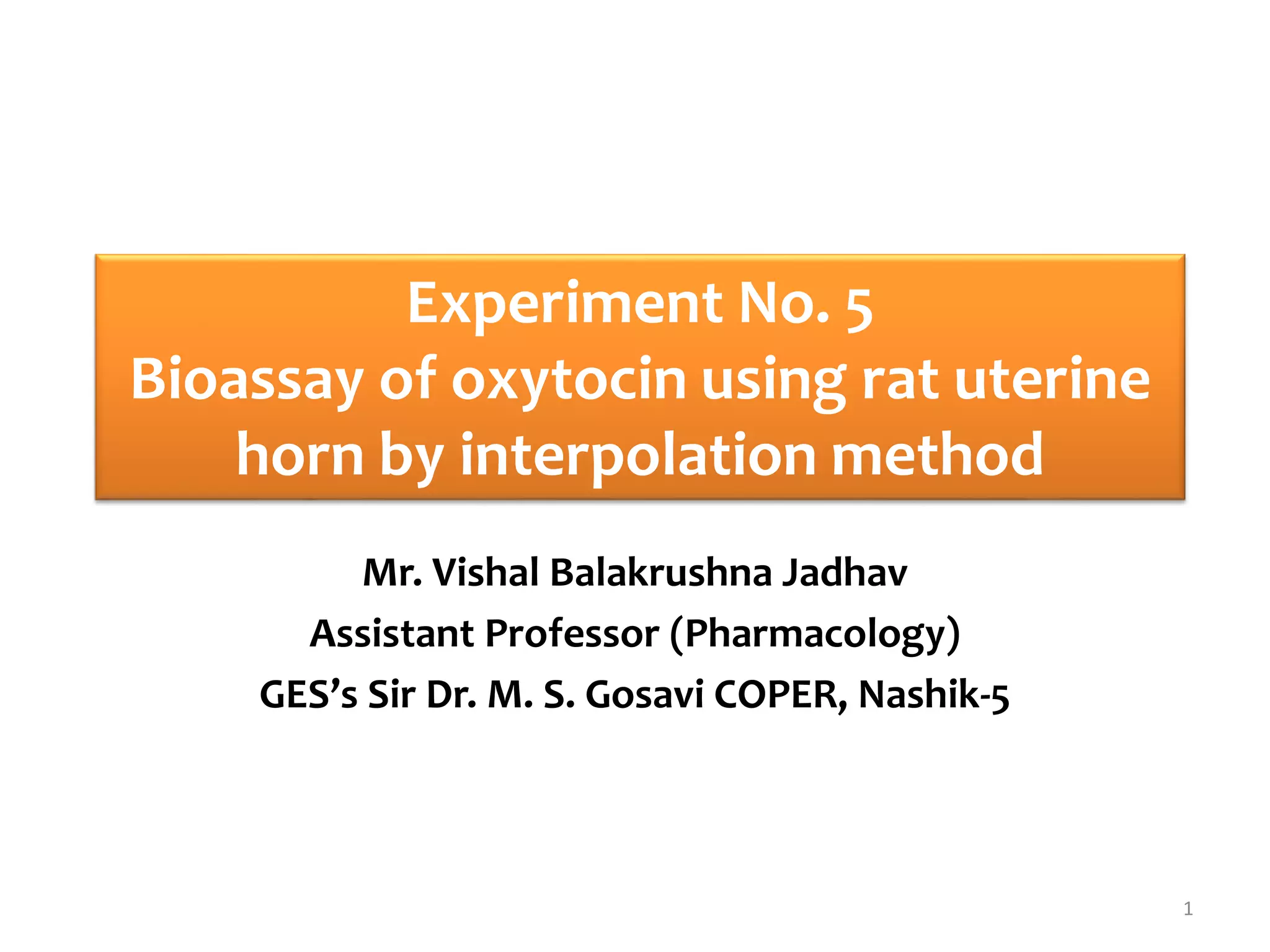 Experiment No. 5 was a bioassay to determine unknown concentrations of oxytocin using isolated rat uterine horns through an interpolation bioassay. Rat uteri were isolated and mounted in an organ bath containing De Jalon solution. A concentration response curve was established for a standard oxytocin solution and responses to test solutions were recorded. The test responses were selected such that they fell on the linear portion of the standard curve. The height of contractions were measured and used to calculate the unknown oxytocin concentrations by interpolating the test responses on the standard curve graphically. The unknown concentrations were determined to be [value 1] μg/ml from one method of calculation and [value 2] μg/ml from the other method.