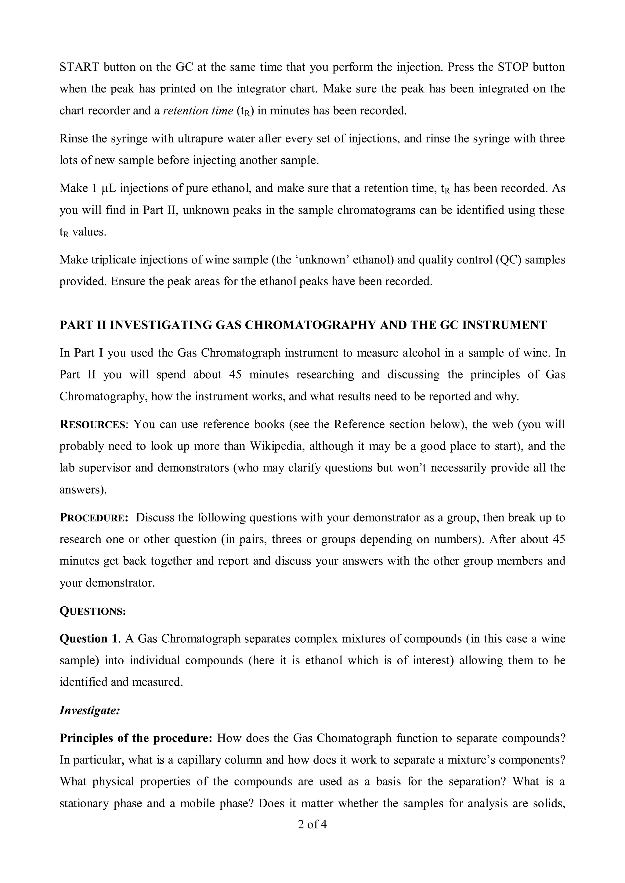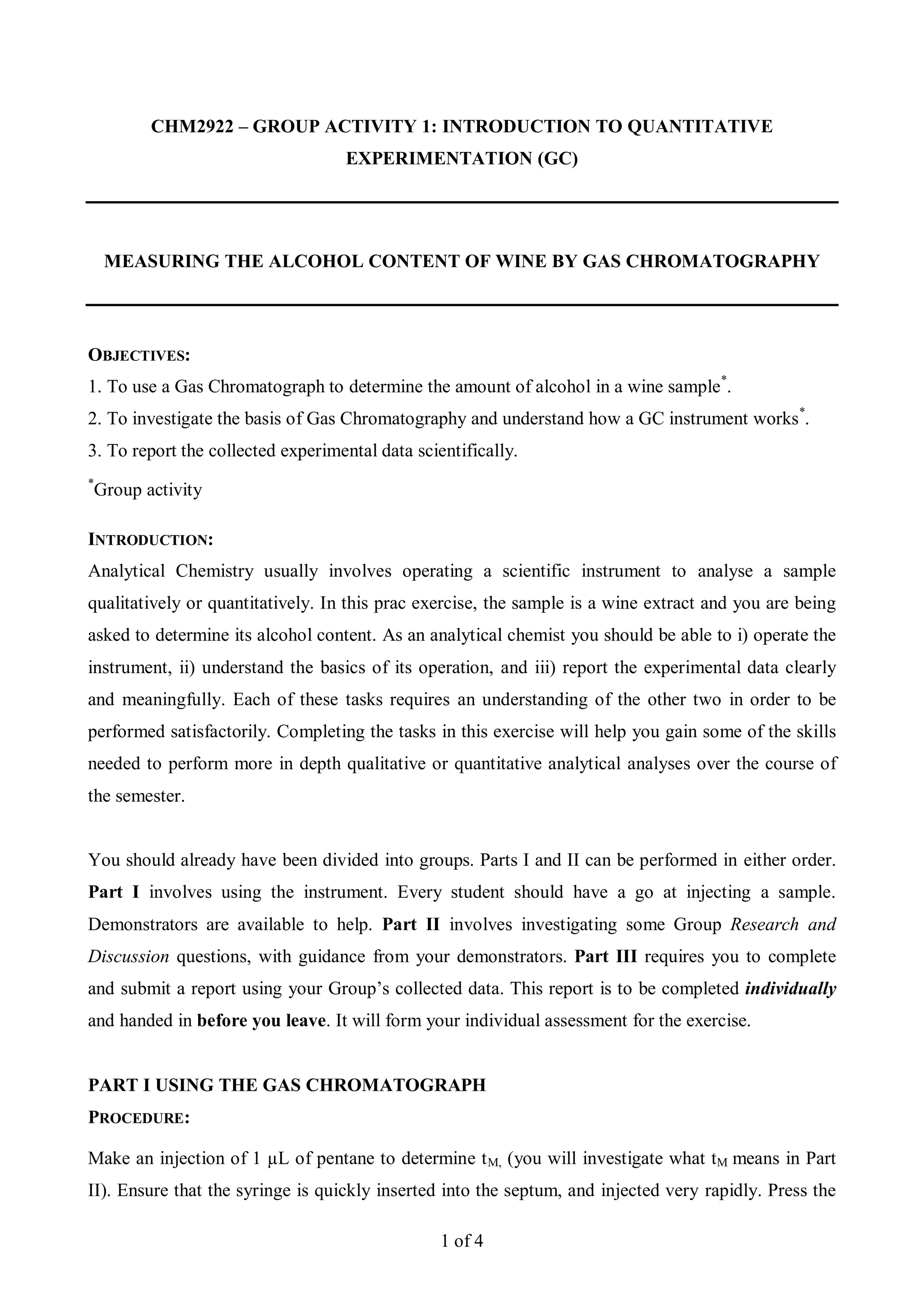 This document outlines an experiment to use gas chromatography to determine the alcohol content of wine. Students will use a gas chromatograph to separate the components in a wine sample and measure the amount of ethanol present. The objectives are to operate the gas chromatograph, understand how it works by separating mixtures into individual compounds, and report the experimental data. Students will collect data on retention times of ethanol and other samples, calculate parameters like capacity factor to quantify results, and analyze errors and quality controls to evaluate their analysis. They will then write a report summarizing the experimental procedure, results, and conclusions.