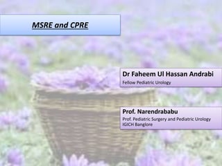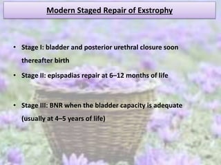 1. Modern staged repair of exstrophy (MSRE) involves closure of the bladder and urethra at birth, epispadias repair at 6-12 months, and bladder neck reconstruction at 4-5 years when bladder capacity is adequate.