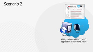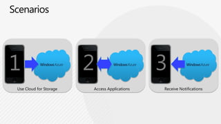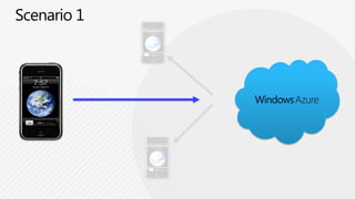 The document discusses developing iPhone and iPad apps that utilize Windows Azure for cloud storage, incorporating blob and table storage for handling different data types. It emphasizes the need for careful implementation due to complex REST signatures and the importance of leveraging push notifications through Apple's Push Notification Service. Recommendations include using hybrid approaches with PhoneGap and ensuring persistent connections using Azure roles for app updates.