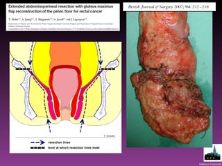 The document discusses surgical outcomes related to colorectal procedures, specifically addressing the challenges and morbidity associated with abdominoperineal excision (APE) and the benefits of extralevator APE (ELAPE). It details the impacts on circumferential resection margin (CRM) positivity, local recurrence rates, and wound healing techniques, suggesting that biological meshes and myocutaneous flaps are beneficial adjuncts for closure. The document emphasizes the need for comparative data to evaluate different surgical methods and improve patient outcomes.