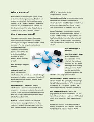A network is a system of interconnected computers or devices that allows for the exchange of data between linked nodes. The key components of a computer network include nodes, network interface cards, communication media, protocols, routers and switches. There are several types of networks including local area networks (LANs) that connect devices within a short distance, metropolitan area networks (MANs) that span a larger physical area than a LAN, and wide area networks (WANs) that connect geographically dispersed LANs over longer distances. The largest WAN is the Internet.
