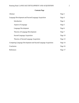 This document provides an overview of a student paper comparing language development in children to second language acquisition in adults. It discusses various theories of both language development and second language acquisition. The key conclusion is that while both are influenced by internal and external factors, the factors differ and are more supportive for language development in children. As adults, the external factors and need that support language development in children are not as strong, making second language acquisition more difficult.
