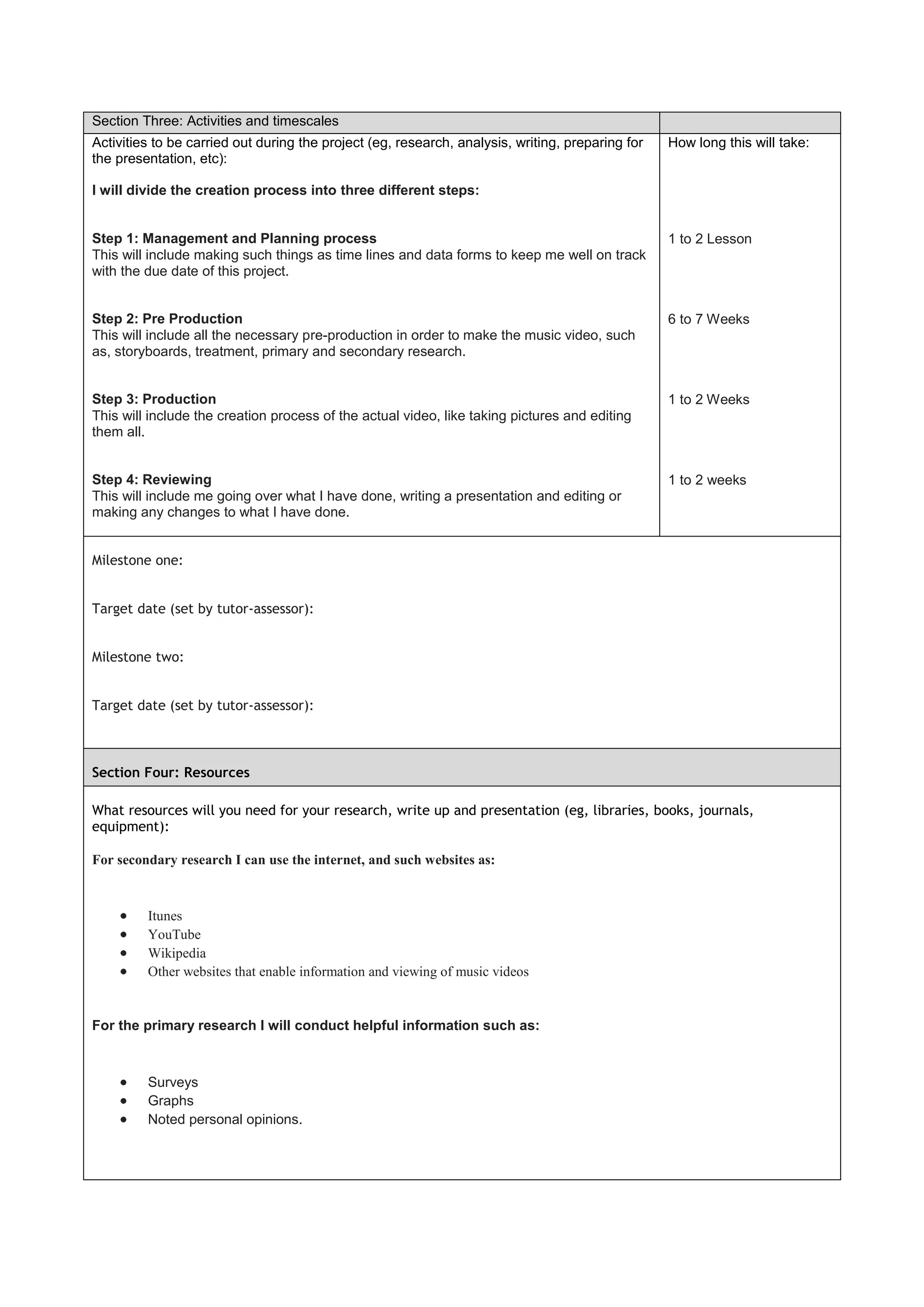 The document is a project proposal form for creating a music video. It includes sections for the learner's name and details, the proposed title, project objectives, responsibilities, reasons for choosing the project, planned activities and timescales, and required resources. The learner's objectives are to learn the full process of creating a music video from pre-production to post-production. Their planned activities include management, planning, pre-production such as storyboards and research, production including filming and editing, and review including a presentation. They expect the project to take approximately 6-7 weeks for pre-production and 1-2 weeks each for production and review. Required resources include internet research, surveys, and filming equipment.