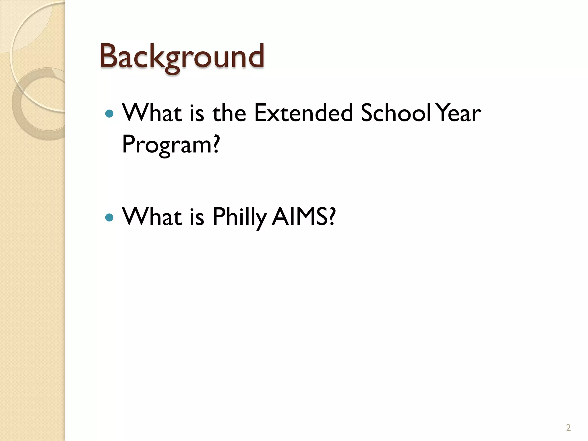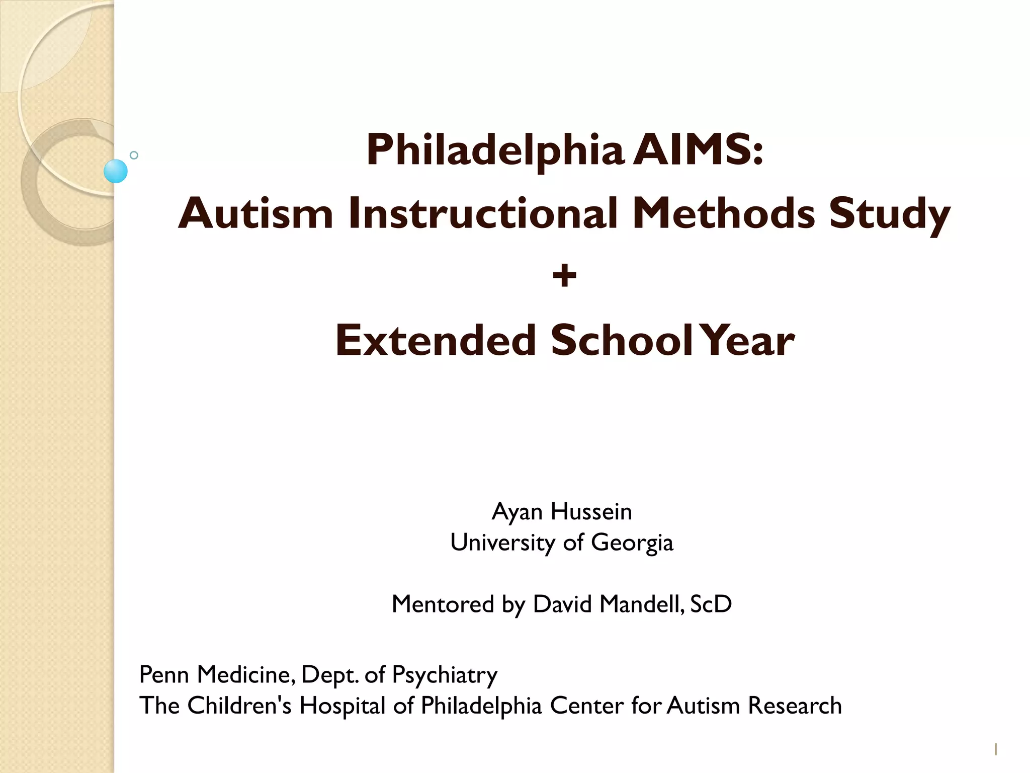 The document summarizes the Philadelphia AIMS (Autism Instructional Methods Study) program and its extended school year program. The study aims to implement evidence-based autism interventions in K-2 grade classrooms and compare the effectiveness of the STAR (Strategies for Teaching based on Autism Research) program versus a structured teaching approach. It provides details on the intervention conditions, classroom and student characteristics, an overview of the STAR program methodology including pivotal response training, and next steps to sustain and expand the program.