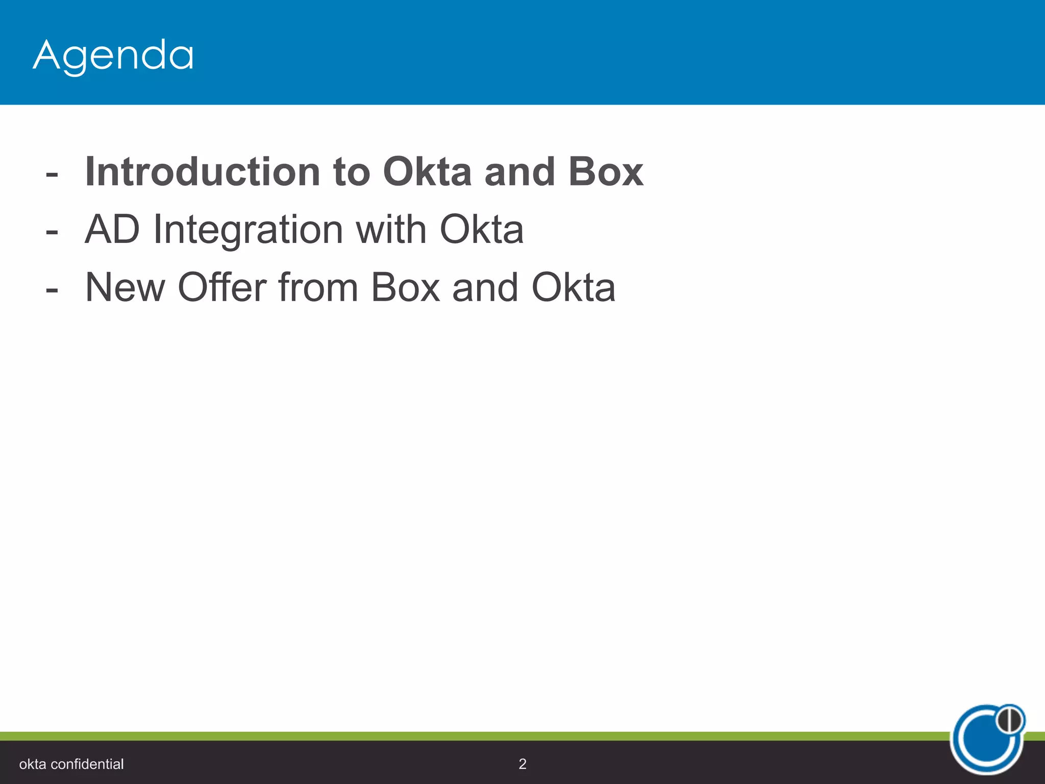 The document outlines the integration of Okta with Box, highlighting the benefits of Active Directory (AD) integration for secure and seamless user access. It emphasizes modern identity management solutions for cloud-based applications and introduces a new offering that allows users to connect Box to AD for free, promoting ease of use and reduced administrative costs. Additionally, the document includes case studies showcasing the successful implementation of these solutions in various organizations.