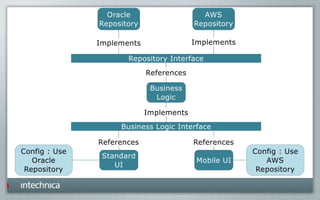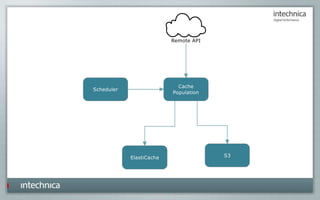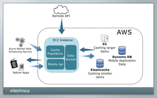 The document discusses extending on-premise applications to the cloud, focusing on the development of mobile applications that integrate with existing systems without disruptions. It highlights the use of AWS and various cloud tools, such as DynamoDB for mobile app data storage, to enable fast data retrieval and management. Intechnica emphasizes the need for proactive caching and flexibility in data handling to accommodate large datasets and ensure performance.