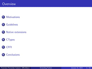 This document discusses different ways to extend Python with C and C++ code. It covers native extensions using the Python/C API, ctypes which provides an advanced foreign function interface, and CFFI which provides another foreign function interface. It provides examples of using each technique and discusses their pros and cons in terms of portability, difficulty of use, and how they interface with shared libraries.