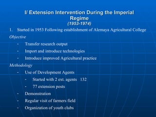 The document summarizes Ethiopia's agricultural extension efforts from 1953 to the present. It describes 3 phases: 1) 1953-1974 under the Imperial regime focusing on demonstration and training, 2) 1974-1991 under military rule expanding minimum package programs, and 3) post-1991 under the current government adopting a participatory approach called PADETES. Key aspects included establishing agricultural colleges, deploying development agents, introducing improved practices, expanding farmer participation, and increasing crop yields through new extension strategies.