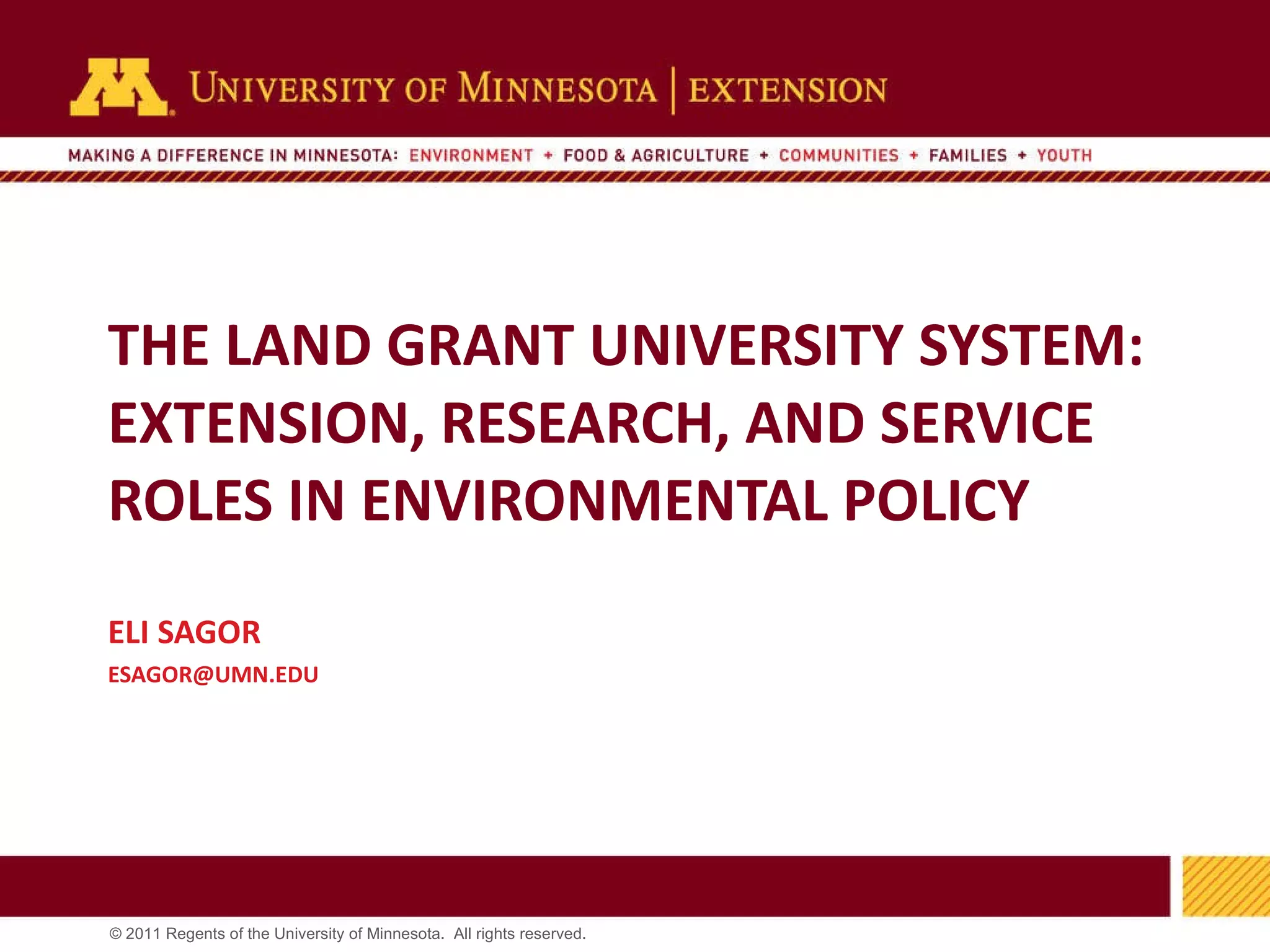 The document discusses the role of land grant universities and their extension, research, and service programs in environmental policy. It describes how the land grant system was established through federal acts to promote teaching, research and extension. It provides examples of how extension, research and technical assistance programs at the University of Minnesota and elsewhere inform and influence environmental policy development and decisions. It also notes challenges in justifying public funding for these services as budgets are reduced.