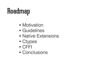 The document discusses extending Python with C through various methods such as native extensions, ctypes, and cffi. It provides code examples for creating and using C libraries within Python, emphasizing performance benefits and integration techniques. Additionally, it covers memory management, error handling, and contrasts the complexity and portability of different approaches.