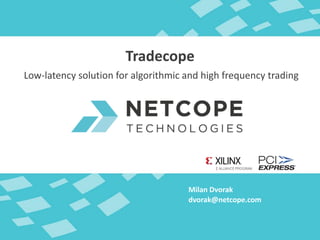 Netcope Technologies offers low-latency FPGA-based solutions for algorithmic and high-frequency trading, emphasizing flexibility and ease of use. Their platform supports various trading protocols and ensures minimal tick-to-trade latency while allowing users to implement custom trading strategies. Key features include pre-trade risk checks and customizable monitoring capabilities, enabling efficient and secure trading operations with multiple exchanges.