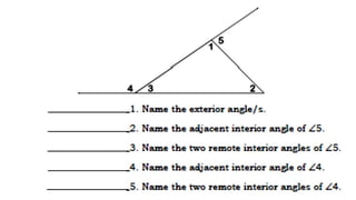 The document discusses the exterior angle theorem and asks the reader to find the values of x and y. However, there is not enough information provided in the document to determine the specific values of x and y. The document appears to be introducing an activity or problem related to the exterior angle theorem but does not include the details necessary to solve for the variables.