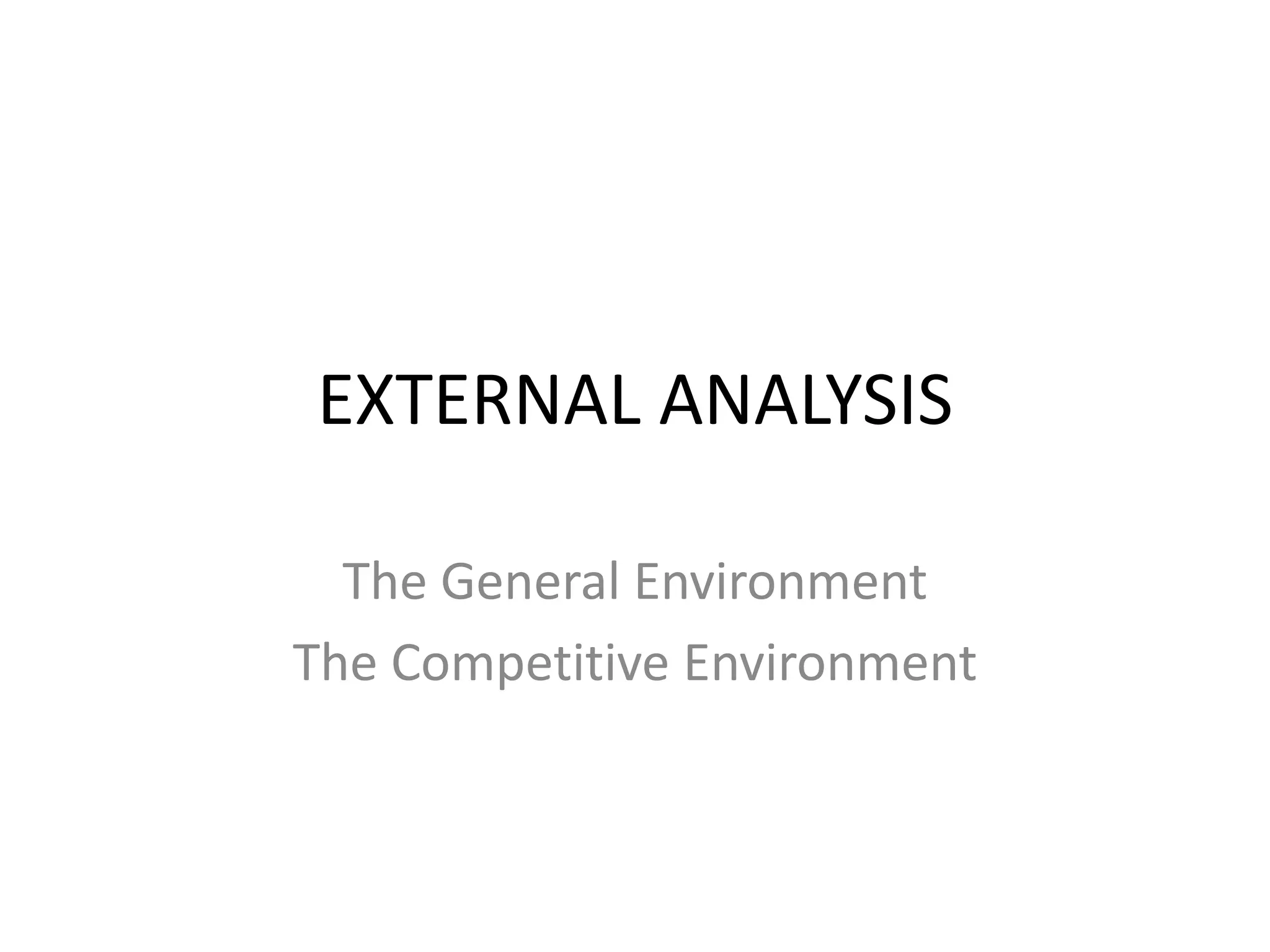 The document discusses external analysis for understanding an industry's competitive environment. It defines key concepts like industry, sector, strategic groups. It also explains Porter's five forces model for analyzing competitive forces that shape an industry - threat of new entry, rivalry among existing firms, bargaining power of buyers and suppliers, threat of substitutes. Finally, it discusses how the general environment/macro factors like political, economic, social and technological aspects (PEST analysis) can impact Porter's five forces.