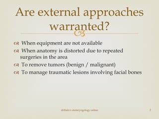 The document discusses various external surgical approaches and techniques in otolaryngology for treating conditions affecting the maxillary sinus, ethmoid sinus, and sphenoid sinus, such as tumor removal and sinusitis management. It details specific procedures like Caldwell-Luc and external ethmoidectomy, including their indications, techniques, post-operative care, and potential complications. Additionally, it outlines different transseptal approaches and frontal sinus surgeries, emphasizing the importance of careful surgical planning due to the complex anatomy and risk of complications.