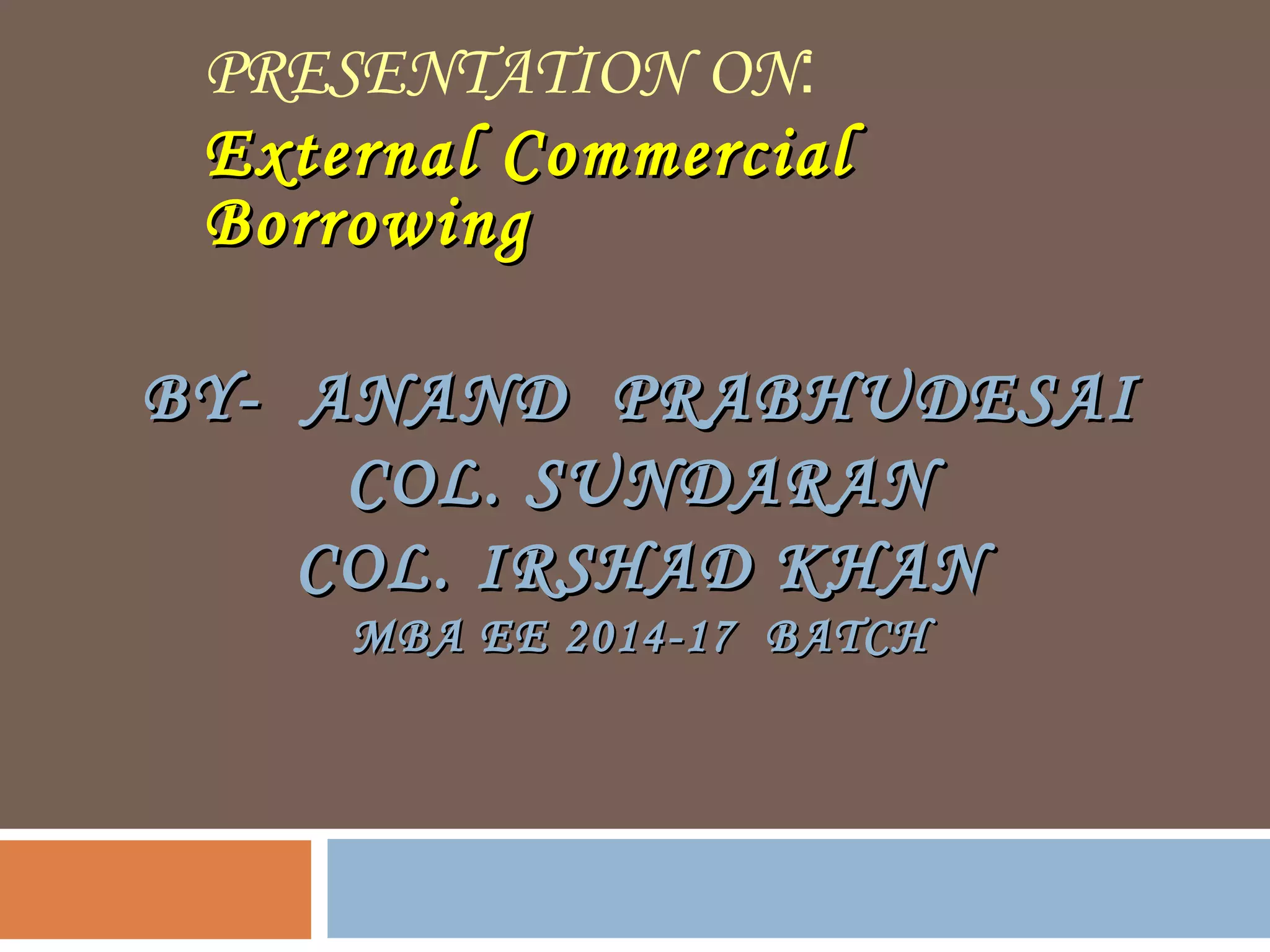 The document provides information on External Commercial Borrowings (ECB) in India. It discusses that ECB refers to commercial loans from foreign sources and is a source of funds for expanding existing capacity or new investments. There are two routes to raise ECB - automatic route which does not require RBI approval for eligible borrowers within certain limits, and approval route which requires RBI approval. Eligible borrowers under automatic route include corporates and housing finance companies, while approval route has additional eligible categories like FIIs dealing with infrastructure. Common recognized lenders include international banks, capital markets and multilateral institutions.