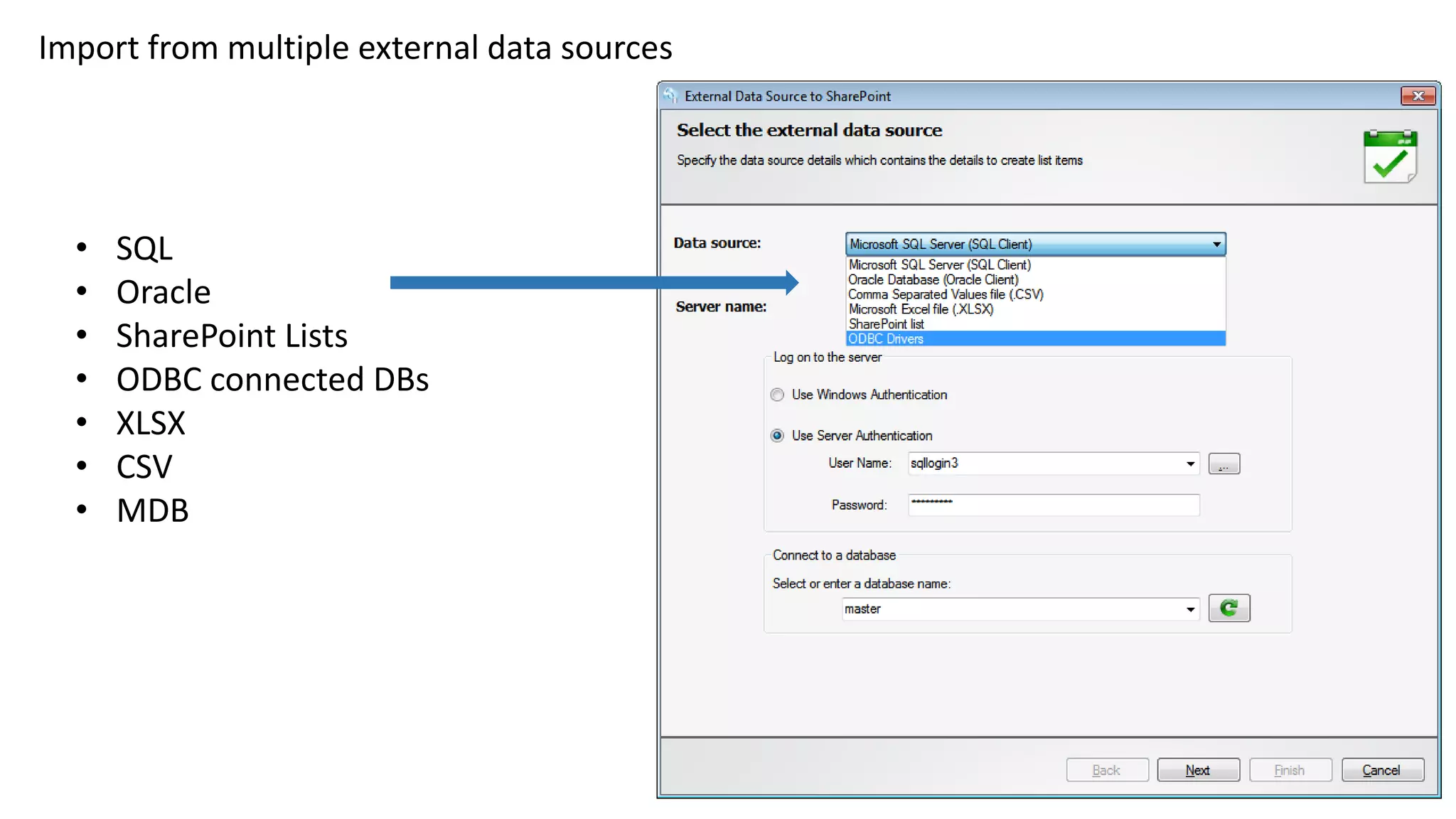 The document describes an external data connector for SharePoint that allows users to query, filter, and import data from various external sources like SQL, Oracle, and Exchange. It supports automatic synchronization of data and provides a query builder for creating custom import conditions, as well as the ability to manage metadata through column mapping. Users can also schedule import tasks and extract emails from Exchange public folders and message folders.