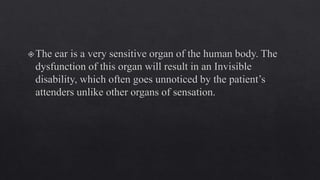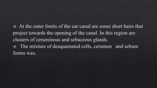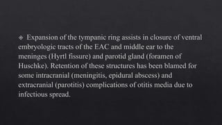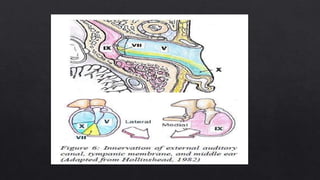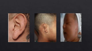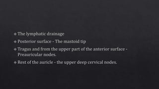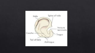 1. The pinna develops from six mesenchymal condensations called the hillocks of His around the first pharyngeal cleft.