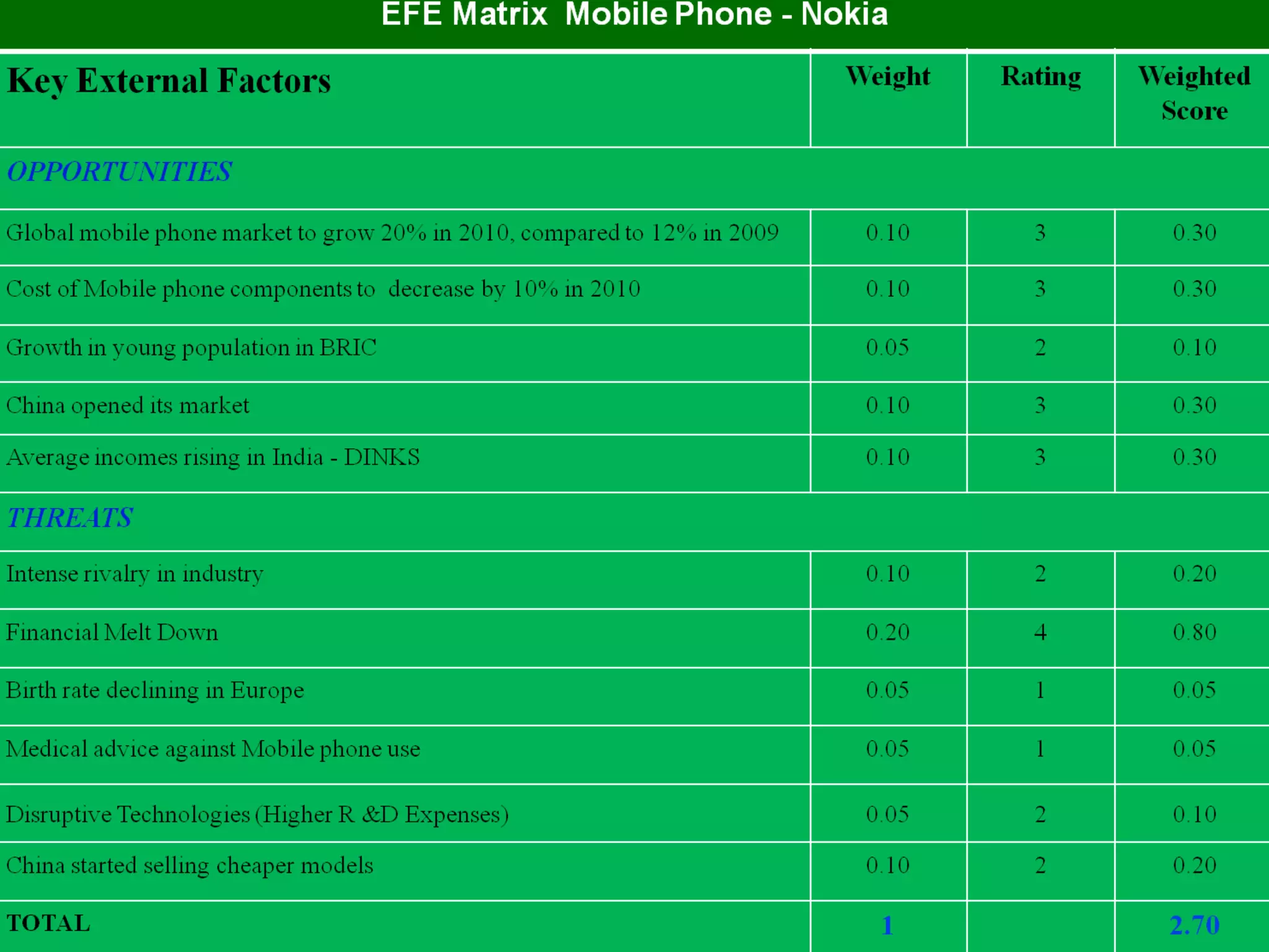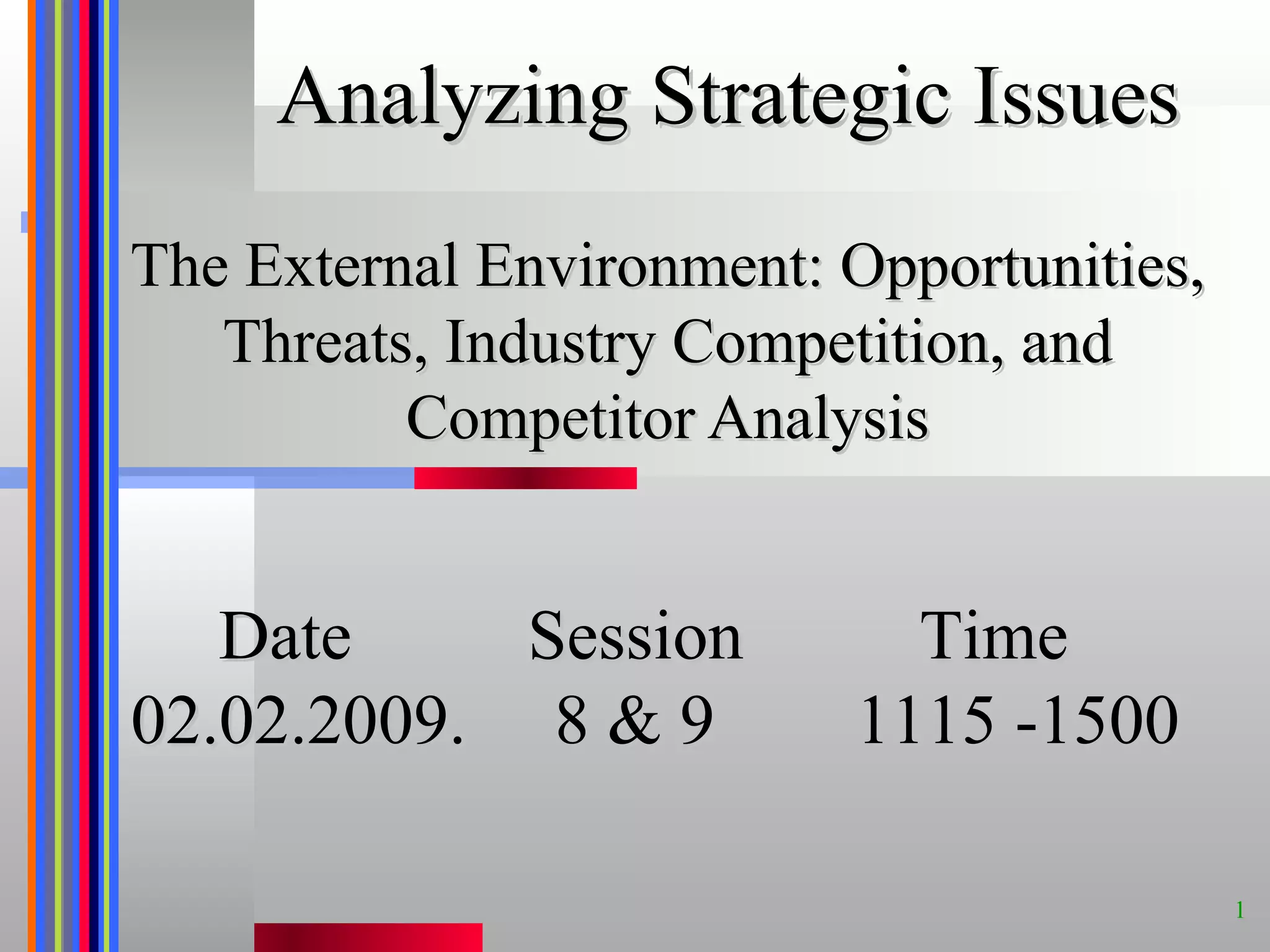 The document discusses analyzing a company's external environment including opportunities and threats. It describes analyzing the general environment factors like demographic, economic, political/legal, socio-cultural, technological, and global influences. It also discusses analyzing the industry environment including the five competitive forces that shape industry competition and profitability: threat of new entrants, power of suppliers, power of buyers, threat of substitutes, and rivalry among existing competitors. Finally, it discusses analyzing competitor environments through assessing competitors' objectives, strategies, assumptions, capabilities, and responses.
