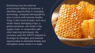 The document discusses the importance of conducting a SWOT analysis, focusing on how external factors such as market trends and regulations impact an organization's success. It outlines the definitions of opportunities and threats, emphasizing the need for a collaborative approach to accurately identify these factors. Additionally, the document highlights common mistakes in SWOT analysis and encourages the integration of other planning tools for comprehensive strategic development.