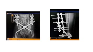 External fixation is a method of stabilizing fractures using pins connected to an external frame. It is indicated for open fractures with soft tissue injury, long bone and pelvic fractures, and in multiple trauma patients. The basic components are pins inserted through bones, clamps connecting pins to rods or rings, and external rods or rings. Proper pin placement and construct are important for stability. Complications can include pin site infections, loosening, and breakage. Care includes daily inspection and cleaning of pins.