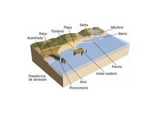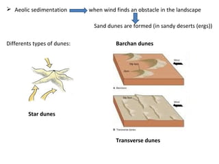 1. External geological agents such as wind, glaciers, water and sea water can cause erosion and sedimentation processes that shape the Earth's surface over time. Wind forms desert pavements and mushroom rocks through deflation and abrasion, and causes aeolian sedimentation forming dune types like barchan and star dunes. Glaciers erode and transport material, forming landforms like moraines.