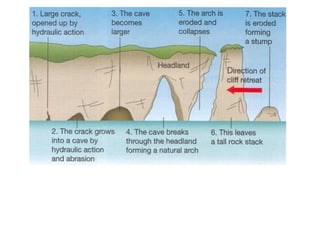 2. Water agents like rivers and streams erode through processes like mass wasting. Rivers progress through stages from youth to maturity that change their valleys and floodplains. Groundwater is stored in aquifers and can dissolve carbonate rock to form karst landscapes with sinkholes and caves.