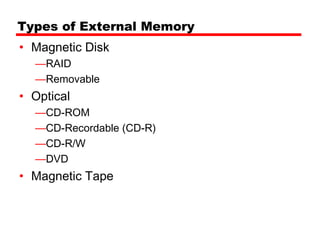 This document discusses various types of external memory used in computer systems, including magnetic disks, optical disks, and magnetic tape. Magnetic disks are the most commonly used and come in removable and fixed varieties, using magnetic coating and read/write heads. Optical disks like CDs and DVDs provide high capacity storage using lasers to read encoded data pits. While slower than disks, magnetic tape remains useful for backup and archiving due to its very low cost per gigabyte.