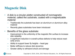 - Descriptions of magnetic disks, including their construction, read/write mechanisms, and data layout on disks.