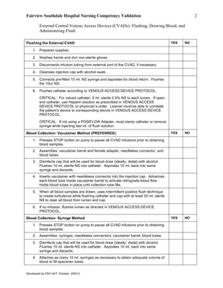 The document outlines the competency validation guidelines for nursing staff on the use of external central venous access devices (CVADs), including procedures for flushing, drawing blood, and administering fluids. It includes criteria for competency assessment, necessary supplies, patient identification, infection checks, and specific techniques for blood collection using both vacutainers and syringes. Additional post-procedure actions and common troubleshooting queries are also addressed to ensure safe and effective practices.