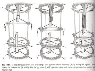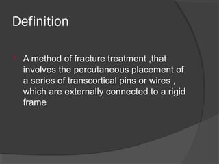 External skeletal fixation techniques involve the percutaneous placement of transcortical pins or wires externally connected to a rigid frame to stabilize fractures. It provides minimally invasive stabilization while preserving blood supply, with advantages of immediate weight bearing and joint mobility. Disadvantages include the need for regular cleaning and monitoring to prevent infection, and higher costs compared to internal fixation. Various configurations and equipment like pins, rings, connectors are used for different applications like fracture fixation, limb lengthening, and deformity corrections.