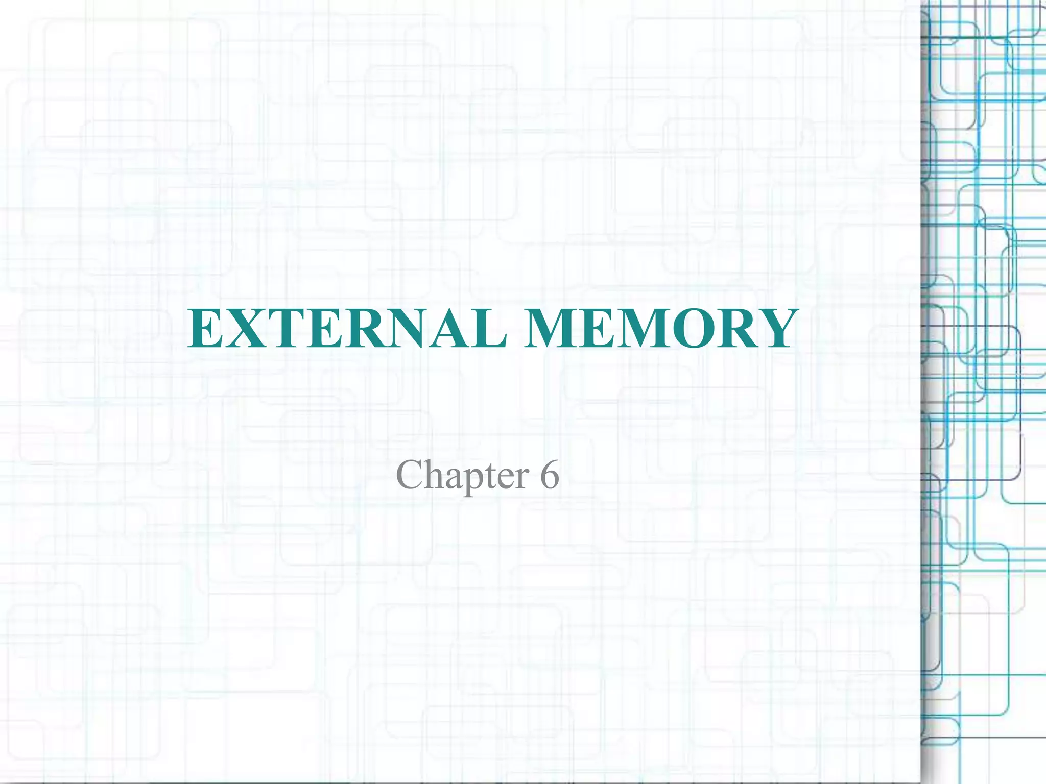 The document summarizes information about external memory, including magnetic disks, RAID, and magnetic tape. It discusses the components and structure of magnetic disks, including platters, heads, tracks, sectors, and formatting. Glass substrates for platters provide benefits like improved uniformity and reduced defects. RAID systems combine multiple disks into a logical unit for redundancy or performance. Common RAID levels include 0, 1, 3, 4, 5 and 6. RAID 0 provides no redundancy but high transfer rates by striping data.