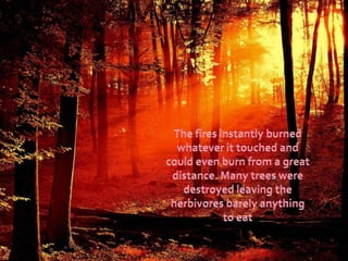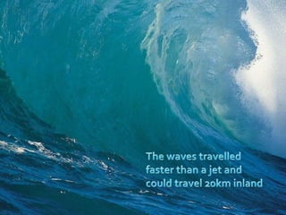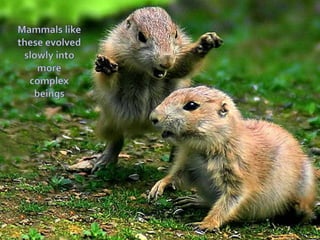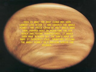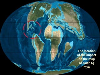 The document discusses the K-T extinction event, where dinosaurs went extinct about 66 million years ago due to an asteroid impact in the Yucatan Peninsula. This event caused widespread destruction through massive dust clouds, forest fires, earthquakes, and tsunamis, leading to a