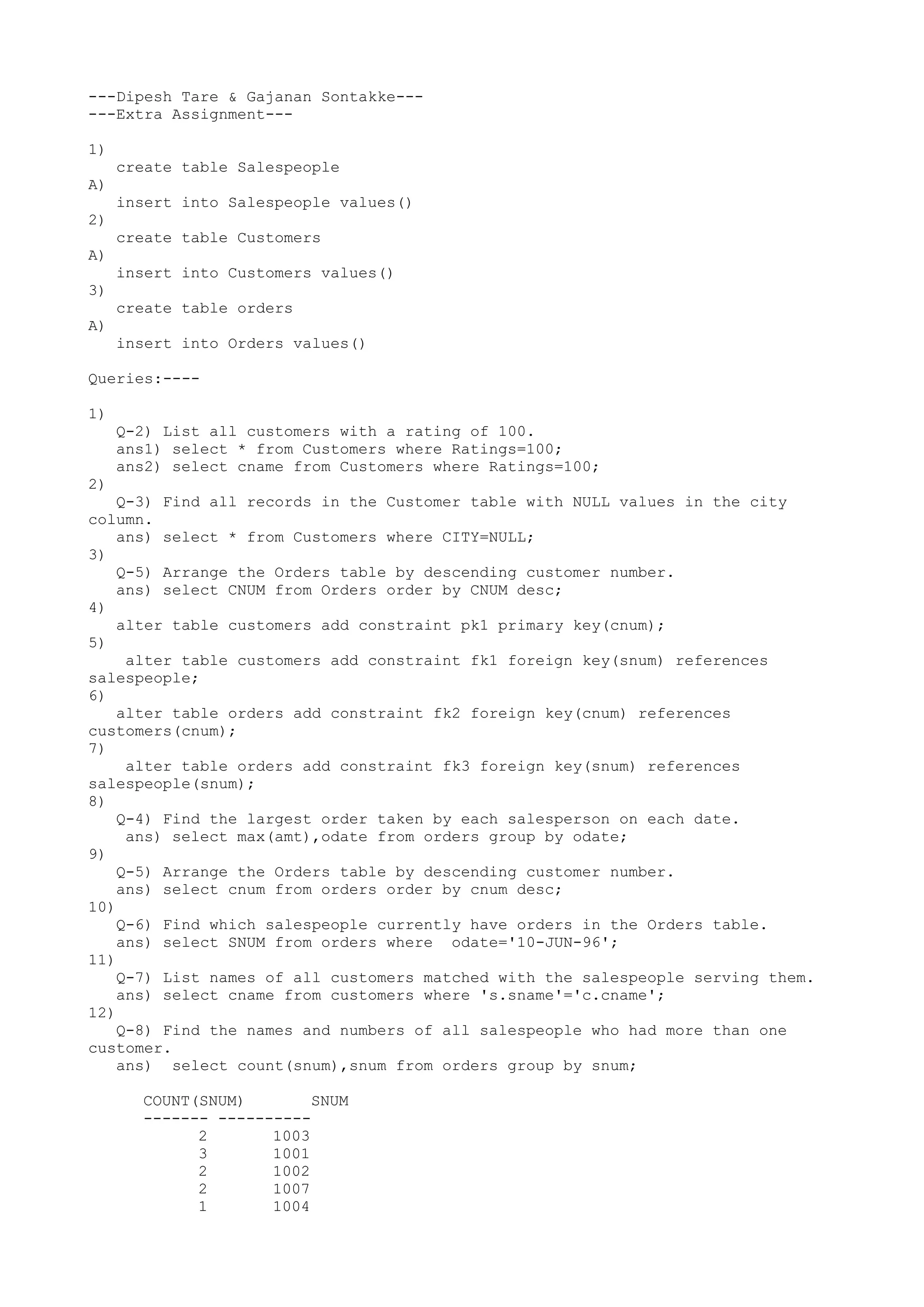 1. The document describes creating and altering tables (Salespeople, Customers, Orders) and adding constraints.