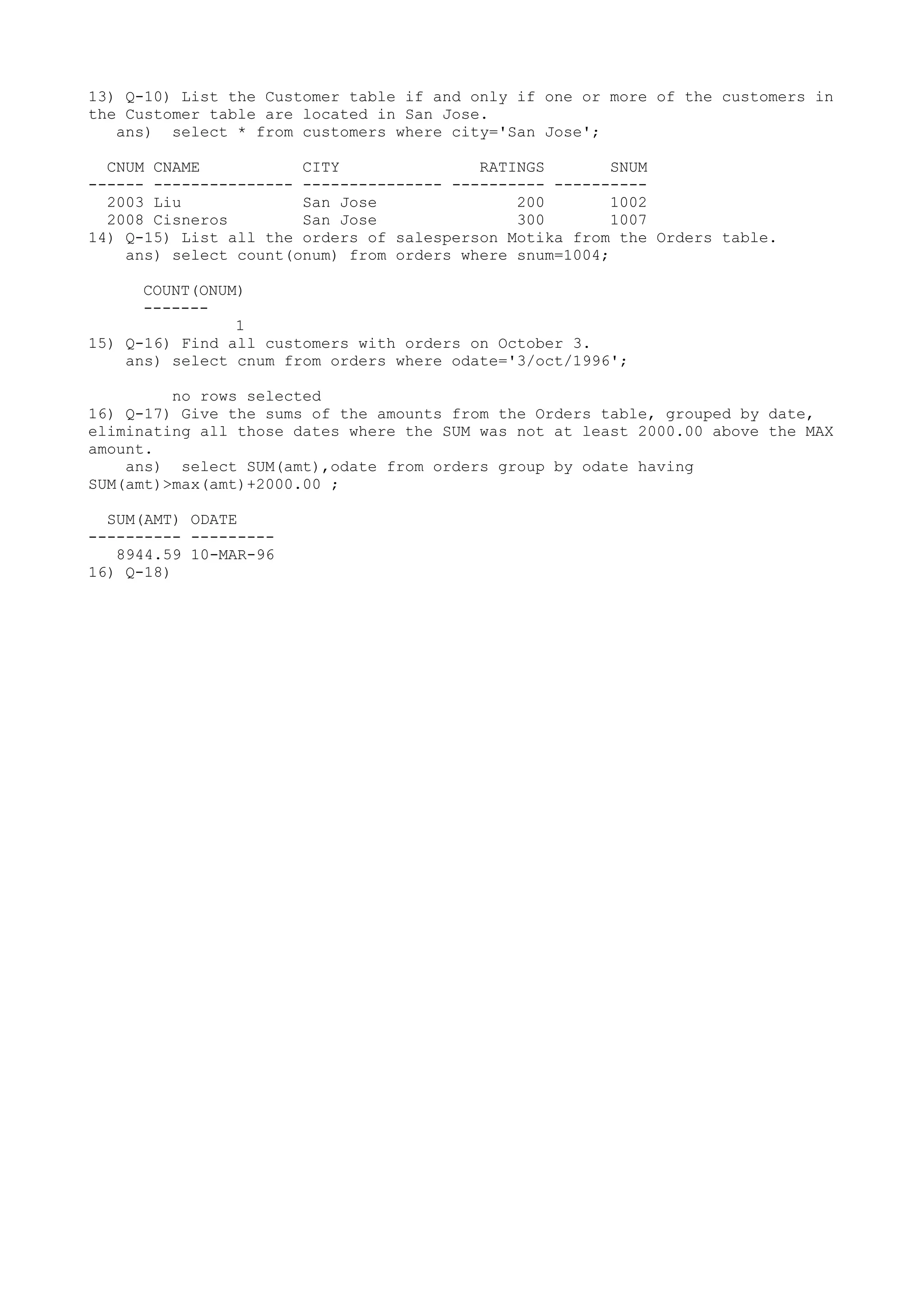 2. It provides the SQL queries and answers for various questions on the tables like finding customers with a rating of 100, orders by descending customer number, and salespeople with more than one customer.