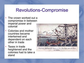 1) The relationship between the British Crown and colonies became increasingly intertwined through trade, leading to tensions over taxes.
