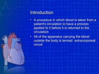 This document discusses extracorporeal circulation, specifically cardiopulmonary bypass (CPB) used during open heart surgery. It describes the basic CPB circuit including components like the venous cannula, reservoir, pump, heat exchanger, oxygenator, and arterial cannula. It outlines the steps of CPB including priming, anticoagulation, cannulation, initiating bypass, maintenance on bypass, weaning from bypass, and potential complications. CPB temporarily takes over the functions of the heart and lungs to provide a still, bloodless field for cardiac surgery using mechanical devices placed outside the body.