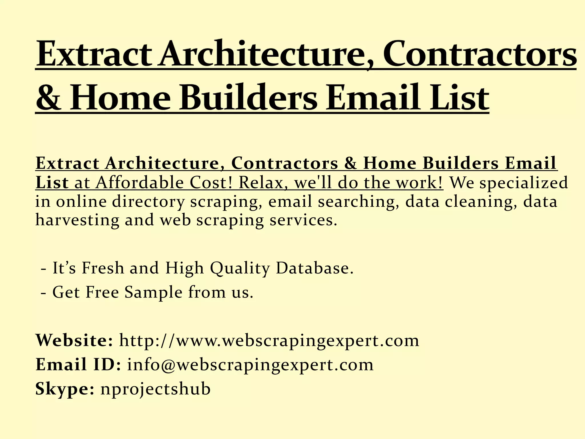 The document promotes a service specializing in scraping and collecting email lists specifically for architecture, contractors, and home builders at an affordable cost. It highlights fresh and high-quality database offerings, free sample availability, and various data scraping services including business directory extraction and data cleaning. Contact information and website links for more details are provided.