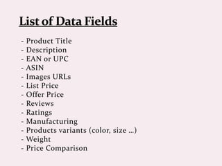 The document promotes a web scraping service that specializes in extracting competitor prices from e-commerce sites at affordable costs. It offers services such as data cleaning, email searching, and harvesting, alongside a high-quality database for price comparison from platforms like eBay, Amazon, and Etsy. Users can obtain a free sample and are provided with various online resources for scraping business and product data.