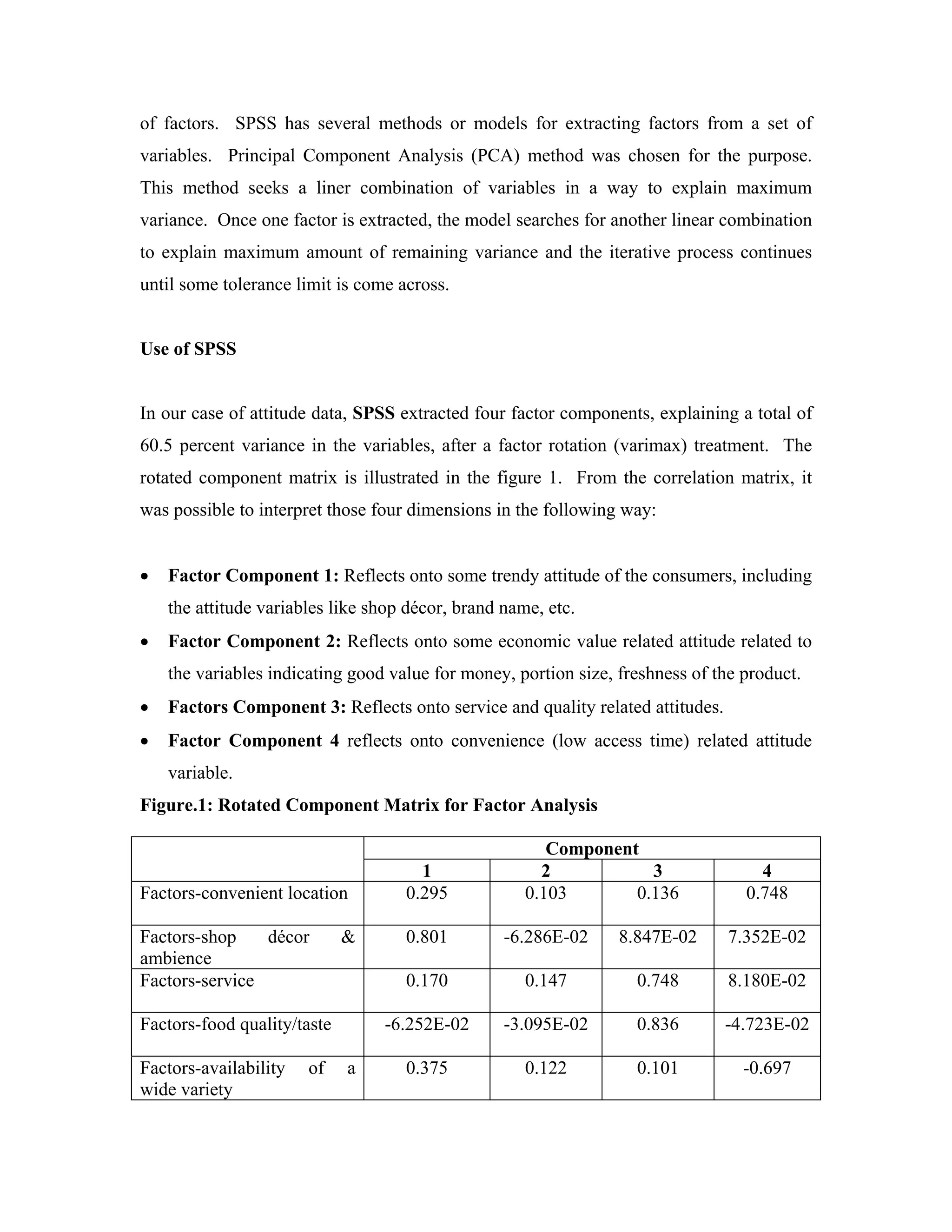 2) Factor analysis using SPSS extracted 4 factors from the attributes that explained 60.5% of the variance: factor 1 reflected trendy attitudes, factor 2 economic value, factor 3 service/quality, and factor 4 convenience.