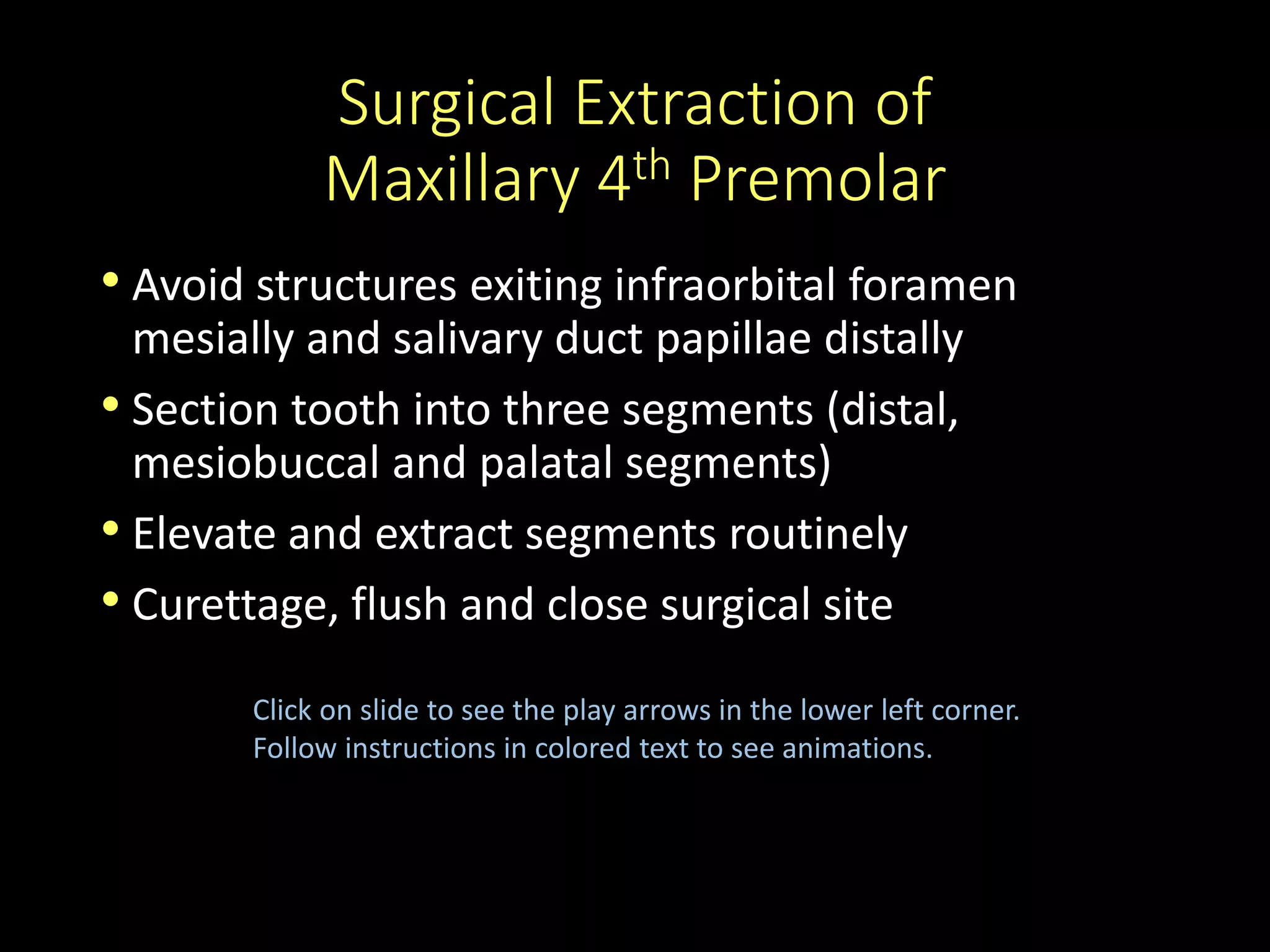 The document summarizes the steps for surgically extracting a maxillary 4th premolar tooth. The steps include: 1) sectioning the tooth into three segments - distal, mesiobuccal, and palatal, 2) elevating and extracting the segments routinely, and 3) curreting, flushing, and closing the surgical site.