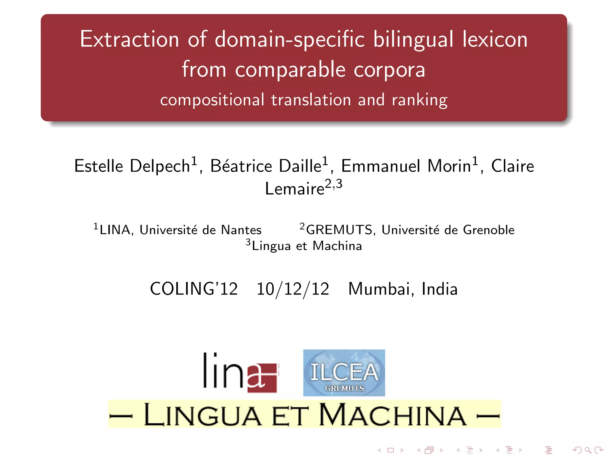 The document describes a method for extracting domain-specific bilingual lexicons from comparable corpora to aid translators when parallel data is unavailable. It discusses compositional translation, which improves precision by analyzing the meanings of term components, outperforming traditional context-based approaches. Results from experiments show that this method can effectively generate translations with high accuracy in specialized fields.