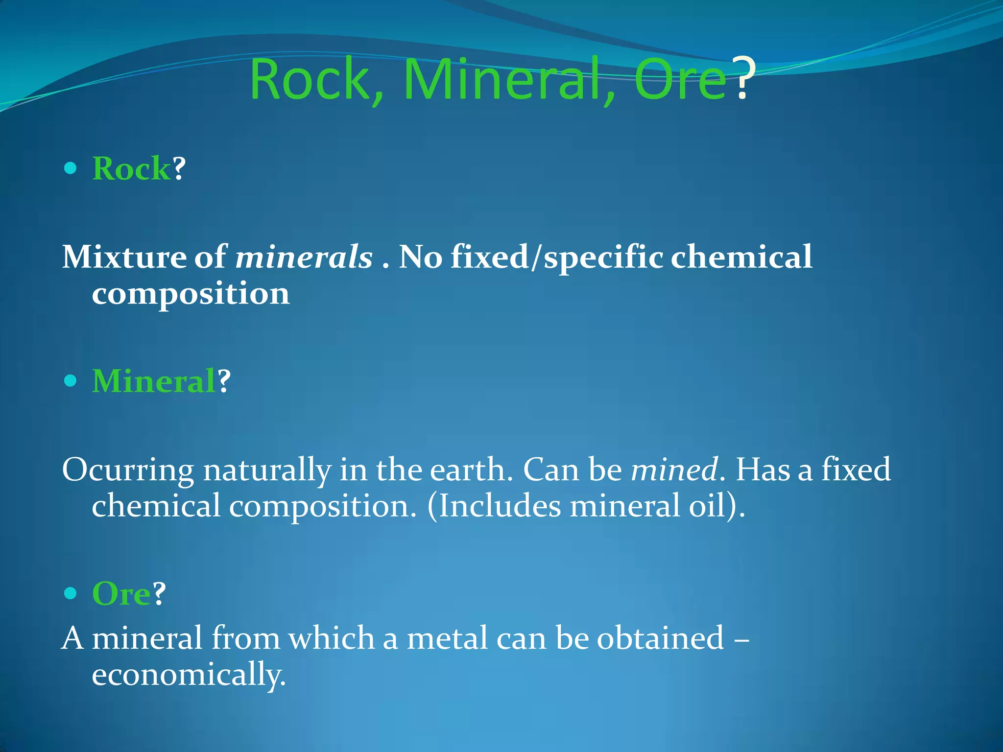 The document discusses the extraction of metals from ores. It begins by defining key terms like rock, mineral, and ore. Rock is a mixture of minerals with no fixed composition, while a mineral occurs naturally and has a fixed chemical composition. An ore is a mineral that a metal can be economically extracted from. The document then provides examples of ancient copper and gold artifacts. It describes an experiment where copper is extracted from copper oxide by heating it with charcoal. Safety precautions for the experiment are outlined. Finally, it prompts the reader to identify the reactants and products in the reaction in order to write the word equation.