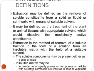 This document defines extraction as the removal of soluble constituents from a solid or liquid with a suitable solvent. It discusses various types of extraction including solid-liquid extraction, liquid-liquid extraction, and expression. Key terms like menstruum, marc, and extractives are defined. Important solvents for extraction like water, alcohol, ether, and chloroform are described. The document also covers the theory of extraction and importance of extraction in quantitative control of drugs and producing more stable, palatable forms.