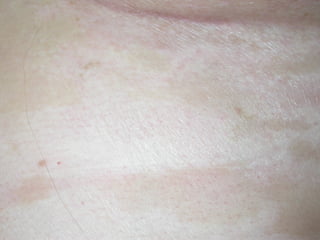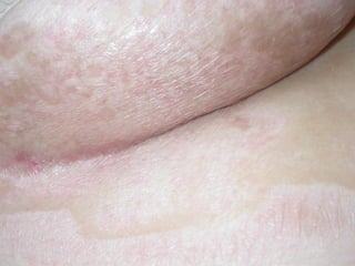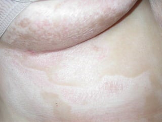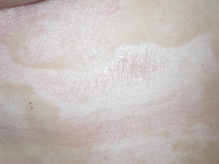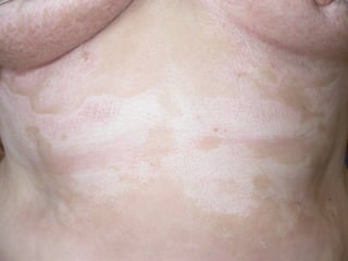 A 50-year-old woman was referred for assessment of hypopigmented, atrophic plaques on her abdomen and inframammary area. A skin biopsy showed epidermal atrophy, vacuolar alteration of the dermo-epidermal junction, and sclerosis of the papillary dermis. Based on the physical examination and biopsy results, the patient was diagnosed with scleroderma.