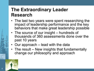 2. Traditional leadership development focuses on fixing weaknesses, but research shows building strengths is more impactful. Having multiple strengths can raise a leader's effectiveness to the 81st percentile.