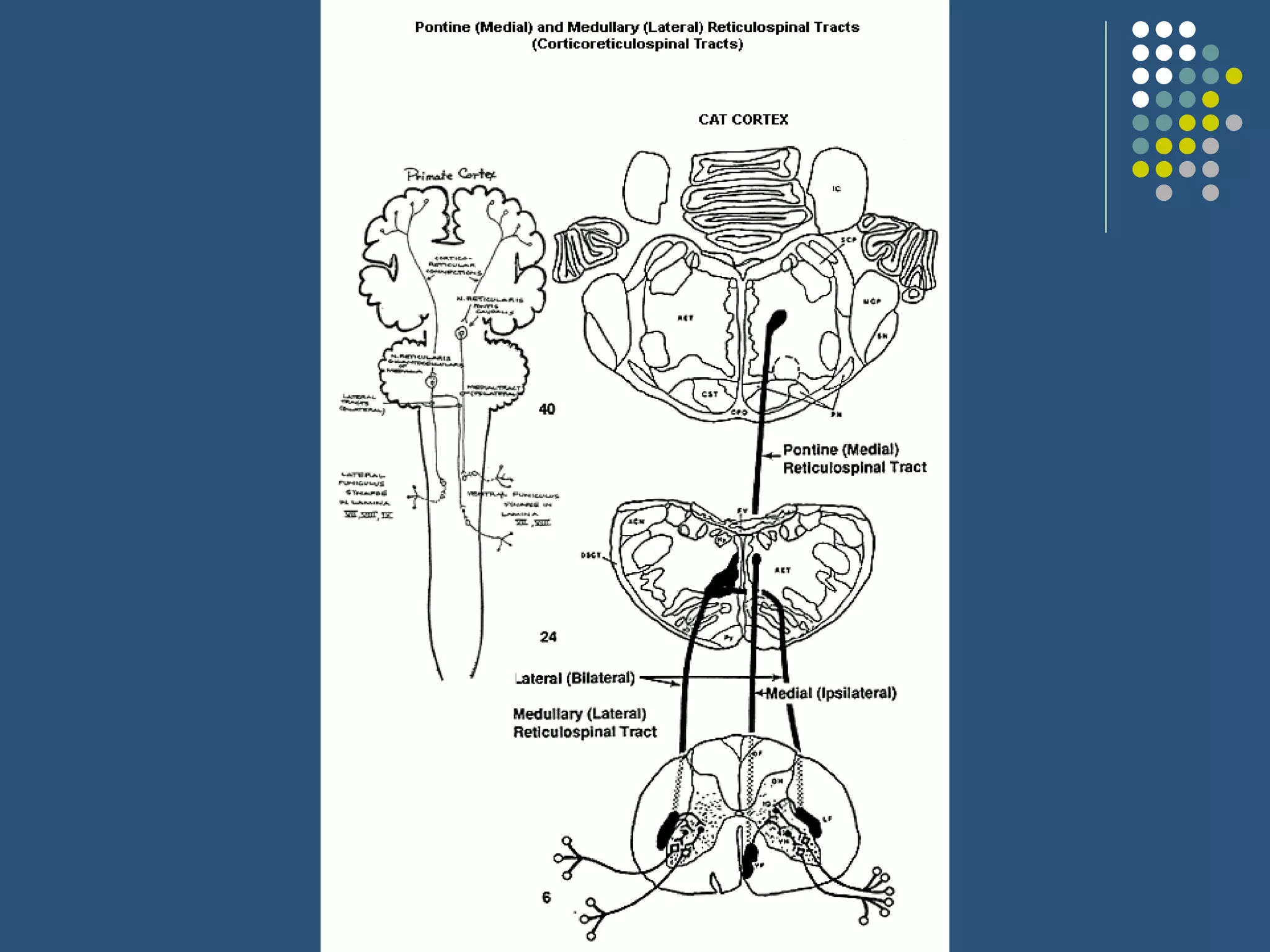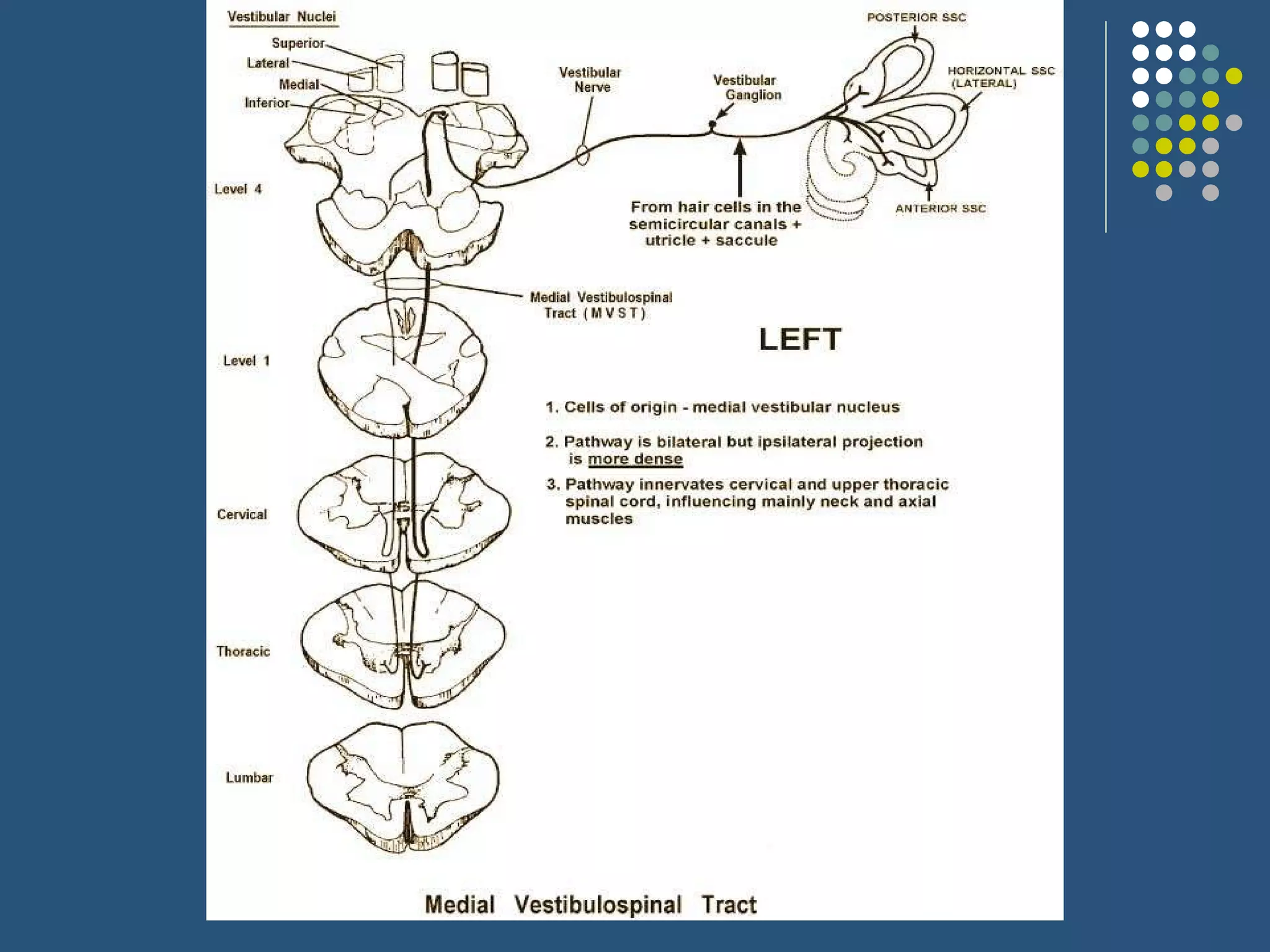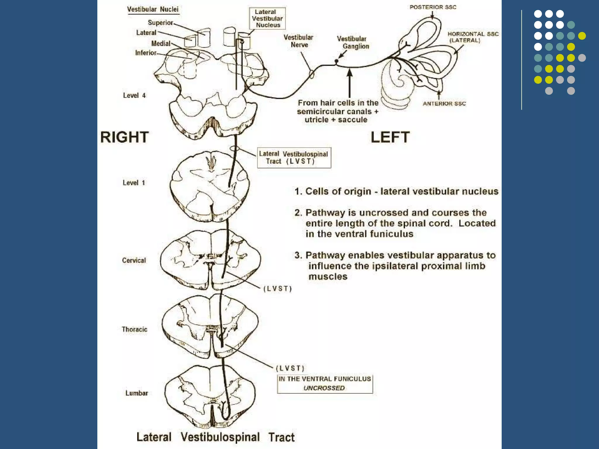 The document discusses various extrapyramidal tracts in the brain and spinal cord that help control motor function. It describes the rubrospinal, reticulospinal, olivospinal, tectospinal, and vestibulospinal tracts, including their origins, pathways, and functions. Common extrapyramidal disorders like Parkinson's disease, chorea, hemiballism, athetosis, dystonia, and tardive dyskinesia are also briefly outlined.