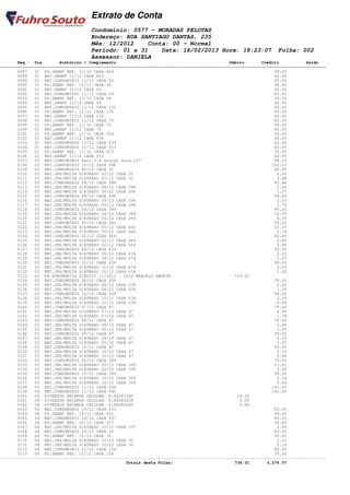 Condomínio: 0577 - MORADAS PELOTAS Endereço: RUA SANTIAGO DANTAS, 235 Mês: 12/2012 Conta: 00 - Normal Período: 01 a 31 Data: 18/02/2013 Hora: 18:23:07 Folha: 002 Assessor: DANIELA Seq.: Dia Histórico / Complemento Débito Crédito Saldo ==================================================================================================================================== 0087 01 PG.SANEP REF. 11/12 CASA 662 39.00 0088 01 REC.SANEP 11/12 CASA 662 42.00 0089 01 REC.CONDOMINIO 11/12 CASA 02 60.00 0090 01 PG.SANEP REF. 11/12 CASA 02 39.00 0091 01 REC.SANEP 11/12 CASA 02 42.00 0092 01 REC.CONDOMINIO 11/12 CASA 04 60.00 0093 01 PG.SANEP REF. 11/12 CASA 04 39.00 0094 01 REC.SANEP 11/12 CASA 04 42.00 0095 01 REC.CONDOMINIO 11/12 CASA 135 60.00 0096 01 PG.SANEP REF. 11/12 CASA 135 39.00 0097 01 REC.SANEP 11/12 CASA 135 42.00 0098 01 REC.CONDOMINIO 11/12 CASA 75 60.00 0099 01 PG.SANEP REF. 11/12 CASA 75 39.00 0100 01 REC.SANEP 11/12 CASA 75 42.00 0101 01 PG.SANEP REF. 11/12 CASA 034 39.00 0102 01 REC.SANEP 11/12 CASA 034 42.00 0103 01 REC.CONDOMINIO 11/12 CASA 034 60.00 0104 01 REC.CONDOMINIO 11/12 CASA 513 60.00 0105 01 PG.SANEP REF. 11/12 CASA 513 39.00 0106 01 REC.SANEP 11/12 CASA 513 42.00 0107 03 REC.CONDOMINIO Parc.3/4 acordo unid.127 88.12 0108 03 REC.CONDOMINIO 10/12 CASA 586 102.03 0109 03 REC.CONDOMINIO 02/12 CASA 31 40.00 0110 03 REC.JRS/MULTA S/ATRASO 02/12 CASA 31 6.80 0111 03 REC.JRS/MULTA S/ATRASO 02/12 CASA 31 0.48 0112 03 REC.CONDOMINIO 08/12 CASA 096 82.46 0113 03 REC.JRS/MULTA S/ATRASO 08/12 CASA 096 3.40 0114 03 REC.JRS/MULTA S/ATRASO 08/12 CASA 096 1.37 0115 03 REC.CONDOMINIO 09/12 CASA 096 99.00 0116 03 REC.JRS/MULTA S/ATRASO 09/12 CASA 096 2.03 0117 03 REC.JRS/MULTA S/ATRASO 09/12 CASA 096 1.70 0118 03 REC.CONDOMINIO 04/12 CASA 394 99.00 0119 03 REC.JRS/MULTA S/ATRASO 04/12 CASA 394 10.15 0120 03 REC.JRS/MULTA S/ATRASO 04/12 CASA 394 4.39 0121 03 REC.CONDOMINIO 05/12 CASA 442 99.00 0122 03 REC.JRS/MULTA S/ATRASO 05/12 CASA 442 10.15 0123 03 REC.JRS/MULTA S/ATRASO 05/12 CASA 442 2.14 0124 03 REC.CONDOMINIO 02/12 CASA 564 40.00 0125 03 REC.JRS/MULTA S/ATRASO 02/12 CASA 564 6.80 0126 03 REC.JRS/MULTA S/ATRASO 02/12 CASA 564 0.48 0127 03 REC.CONDOMINIO 09/12 CASA 634 99.00 0128 03 REC.JRS/MULTA S/ATRASO 09/12 CASA 634 2.03 0129 03 REC.JRS/MULTA S/ATRASO 09/12 CASA 634 1.47 0130 03 REC.CONDOMINIO 10/12 CASA 634 99.00 0131 03 REC.JRS/MULTA S/ATRASO 10/12 CASA 634 2.03 0132 03 REC.JRS/MULTA S/ATRASO 10/12 CASA 634 1.42 0133 03 PG.HONORARIOS SINDICO 11/2012 - LUIS MARCELO AMORIM 714.01 0134 03 REC.CONDOMINIO 08/12 CASA 039 79.00 0135 03 REC.JRS/MULTA S/ATRASO 08/12 CASA 039 3.26 0136 03 REC.JRS/MULTA S/ATRASO 08/12 CASA 039 1.39 0137 03 REC.CONDOMINIO 10/12 CASA 039 99.00 0138 03 REC.JRS/MULTA S/ATRASO 10/12 CASA 039 2.19 0139 03 REC.JRS/MULTA S/ATRASO 10/12 CASA 039 0.84 0140 03 REC.CONDOMINIO 07/12 CASA 47 79.00 0141 03 REC.JRS/MULTA S/ATRASO 07/12 CASA 47 4.89 0142 03 REC.JRS/MULTA S/ATRASO 07/12 CASA 47 1.74 0143 03 REC.CONDOMINIO 08/12 CASA 47 79.00 0144 03 REC.JRS/MULTA S/ATRASO 08/12 CASA 47 3.26 0145 03 REC.JRS/MULTA S/ATRASO 08/12 CASA 47 1.39 0146 03 REC.CONDOMINIO 09/12 CASA 47 99.00 0147 03 REC.JRS/MULTA S/ATRASO 09/12 CASA 47 2.19 0148 03 REC.JRS/MULTA S/ATRASO 09/12 CASA 47 1.95 0149 03 REC.CONDOMINIO 10/12 CASA 47 99.00 0150 03 REC.JRS/MULTA S/ATRASO 10/12 CASA 47 2.19 0151 03 REC.JRS/MULTA S/ATRASO 10/12 CASA 47 0.84 0152 03 REC.CONDOMINIO 02/12 CASA 399 79.00 0153 03 REC.JRS/MULTA S/ATRASO 02/12 CASA 399 11.41 0154 03 REC.JRS/MULTA S/ATRASO 02/12 CASA 399 2.99 0155 03 REC.CONDOMINIO 10/12 CASA 399 99.00 0156 03 REC.JRS/MULTA S/ATRASO 10/12 CASA 399 2.19 0157 03 REC.JRS/MULTA S/ATRASO 10/12 CASA 399 0.84 0158 03 REC.CONDOMINIO 11/12 CASA 506 141.00 0159 04 REC.CONDOMINIO 11/12 CASA 585 141.00 0160 04 DIVERSOS RECARGA CELULAR- F:84381045 10.00 0161 04 DIVERSOS RECARGA CELULAR- F:84282628 5.00 0162 04 DIVERSOS RECARGA CELULAR- F:84282640 5.00 0163 04 REC.CONDOMINIO 10/12 CASA 651 60.00 0164 04 PG.SANEP REF. 10/12 CASA 651 39.00 0165 04 REC.CONDOMINIO 10/12 CASA 537 60.00 0166 04 PG.SANEP REF. 10/12 CASA 537 39.00 0167 04 REC.JRS/MULTA S/ATRASO 10/12 CASA 537 2.84 0168 04 REC.CONDOMINIO 10/12 CASA 30 60.00 0169 04 PG.SANEP REF. 10/12 CASA 30 39.00 0170 04 REC.JRS/MULTA S/ATRASO 10/12 CASA 30 3.03 0171 04 REC.JRS/MULTA S/ATRASO 10/12 CASA 30 3.19 0172 04 REC.CONDOMINIO 11/12 CASA 154 60.00 0173 04 PG.SANEP REF. 11/12 CASA 154 39.00 ------------------------------------------------------------------------------------------------------------------------------------ Totais desta Folha: 734.01 3,274.07